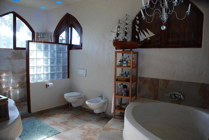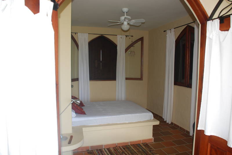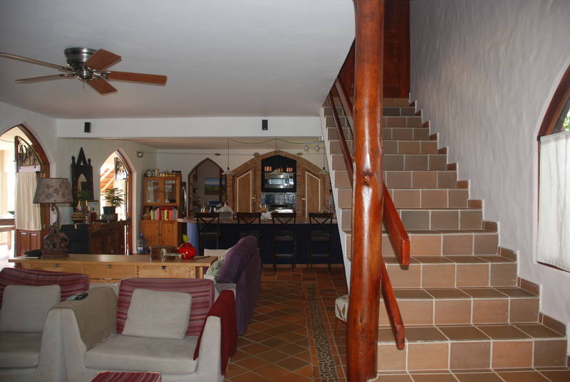 Mit seinen Bögen über Fenstern und Türen wurde hier ein einzigartiges Design geschaffen. Vor dem Wohnbereich befindet die großzügige Terrasse mit Blick in den wunderschön gestalteten tropischen Garten und über die große Poolanlage. Hier genießen Sie morgens wunderschöne karibische Sonnenaufgänge und lassen den Tag bei einem leckeren Cocktail ausklingen. Von hier betreten Sie auch die zwei geräumigen Gästeschlafzimmer mit separatem Bad.