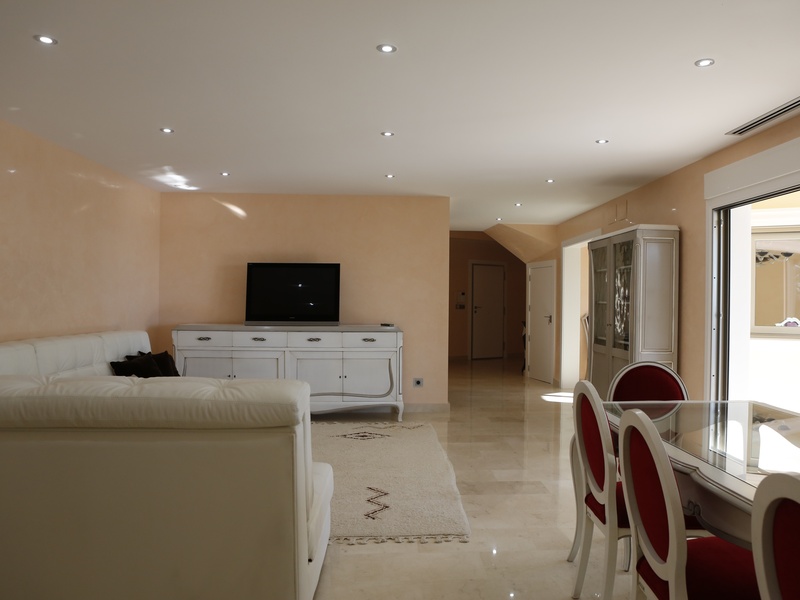 На первом этаже, кроме зала , отдельной столовой и кухни, находятся 3 спальни со своими ванными комнатами. Парадная мраморная лестница, с кокетливо свешивающейся люстрой, ведет в главную спальную комнату с огромной террасой и видом на море .