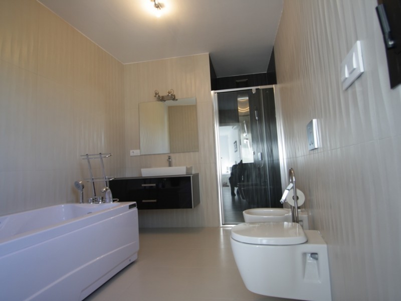 При создании дизайна дома главный акцент был сделан на стекло. Благодаря панорамным окнам и полному застеклению некоторых участков дома интерьеры наполнены натуральным светом большую часть светового дня, создавая иллюзию легкости и прозрачности. Особенностью интерьера являются открытые пространства, в которых гармонично сочетаются различные архитектурные элементы. Все отделочные работы выполнены из высококлассных материалов. Сантехника, керамика и кухонное оборудование от эксклюзивных марок.
