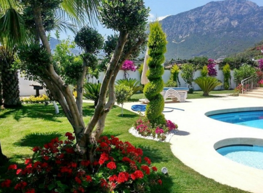 The villa is fenced, has a private swimming pool with children's section, a well-groomed garden with exotic plants and flowers, a large terrace with views of the mountains in front of the swimming pool.