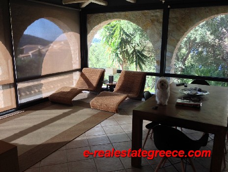 Stone house for sale. It is 278 sq.m. It consists of three bedrooms, living room, kitchen and two bathrooms. It is fully furnished in a minimal aesthetic. It offers unobstructed view to the sea, 2 parking spaces, 60 sq.m. pool, basement, air conditioning, central heating and garden. The house has mark of EOT and can be rent with high income. It is located within 4000 sq.m. of land, in Sivota of Thesprotia, Greece.