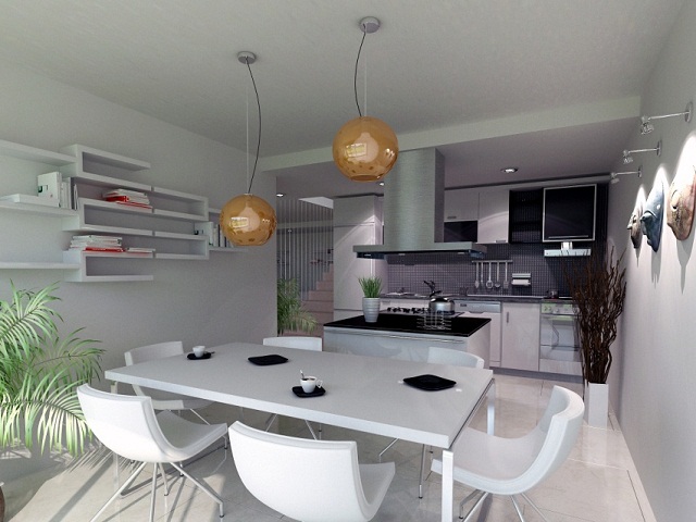 • Интерьер кухни эстетически дополняют подвесной потолок и современное встроеннное освещение