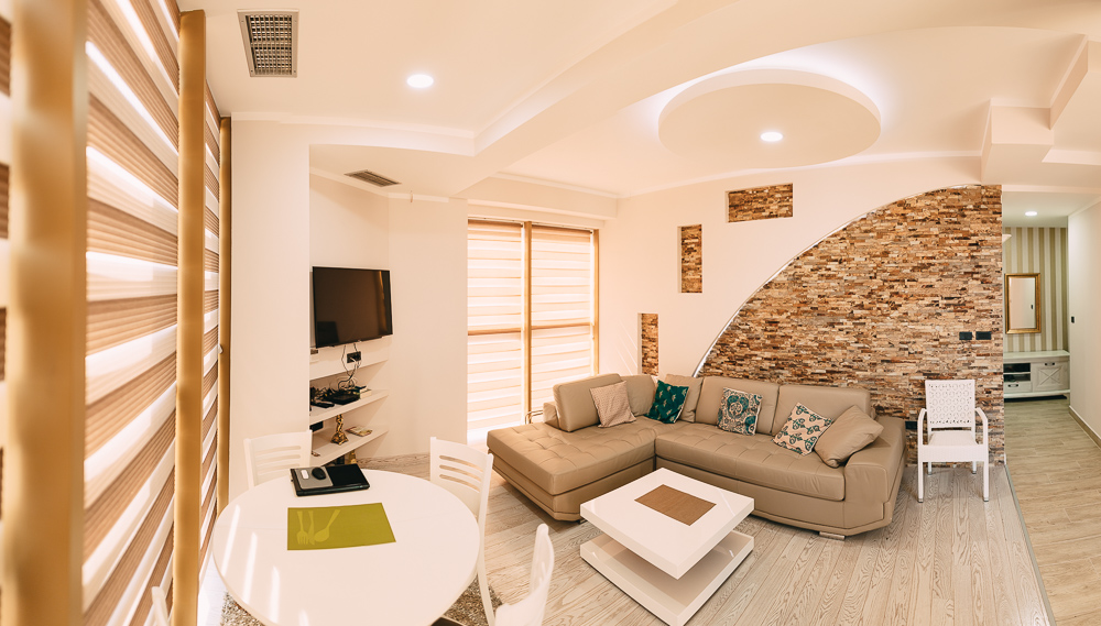 The base of the building - the framework is made from reinforced concrete, external walls - brick, with a layer of insulating material. The facade is covered with “Travertini” granite. Structures built using this technology have high strength, which is very important in a seismically hazardous area, like Montenegro. Electrical wiring and plumbing is installed inside the concrete walls before pouring concrete. This increases reliability and eliminates the possibility of damage during use.