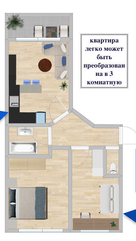 , У вас есть возможность переделать квартиру трехкомнатную.