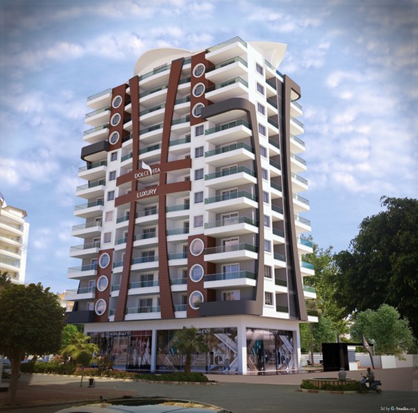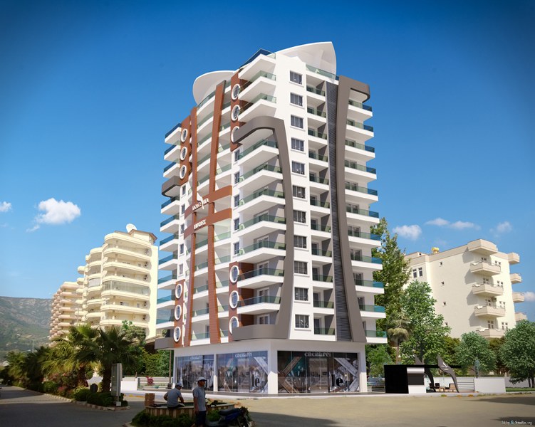 This new residential complex is located just 350 meters from the sea and is located on one of the main streets of Mahmutlar, near the center. The project consists of 11 floors with a total of 56 apartments, 31 one-bedroom apartment (1 + 1), 20 two-bedroom apartments (2 + 1) and 4 penthouses (2 + 1 and 4 + 1). From the central balcony of the complex offers a magnificent view of the sea and the mountains. The area around the complex is built up for a long time, so you are guaranteed to will continue to enjoy this beautiful view.