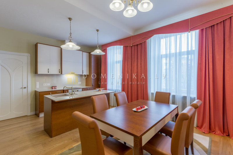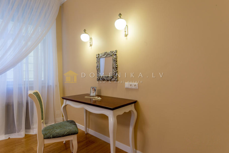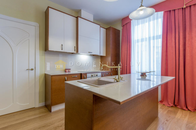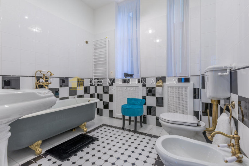 The spacious 4-bedroom apartment with designer renovated in the historic center of Riga (embassy area) on the corner of Dzirnavu and Antonijas. The house is located in the prestigious embassy district, within walking distance of schools, kindergartens, shops, banks, public transport, cafes and restaurants. Sophisticated and comfortable layout: entrance hall with wardrobe, spacious living room with fireplace and kitchen area, three separate rooms, a large bathroom and a utility room for washing and drying machines. During the repair works were used only quality materials, replaced all utilities, plumbing from leading Italian manufacturers, built-in home kitchen BOSCH appliances, set carved wooden doors, oak window sills, wooden windows manufactured Staļi, double front doors - metal with wooden paneling and carved wooden, floor heating in the bathroom, security alarm system, video door phone, computer and TV networks. The apartment interior designed by designer, who tried to keep the charm and fascination of Art Nouveau era. Here you will see a restored cast-iron battery legged cast-iron bathtub on legs griffin, in the restored entrance hall mirror 1870, the stucco on the ceiling, stained glass chandeliers in Tiffany style. The apartment is after renovation nobody lived. Front entrance from the street Antonijas, all the windows are located on street Antonijas and only the window of the master bedroom in a quiet courtyard. Landscaped entrance with a combination lock and intercom system, modern elevator. Near the house there are several car parkovok.Nahoditsya on our website ID225027.