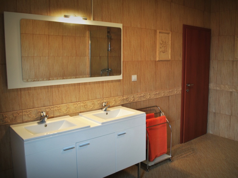 На втором – Две просторные спальни с выходом на террасу. Одна спальня с собственной небольшой ванной комнатой. И ещё огромная ванная комната общая для всего второго этажа.