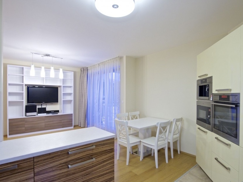 Планировка квартиры состоит из гостиной с изготовленной по специальному заказу кухней-нишей и выходом на балкон, далее 3-х спален (одна из них с собственной ванной комнатой с душем и туалетом), общей ванной комнаты с ванной и туалетом, гардеробной и просторного коридора.