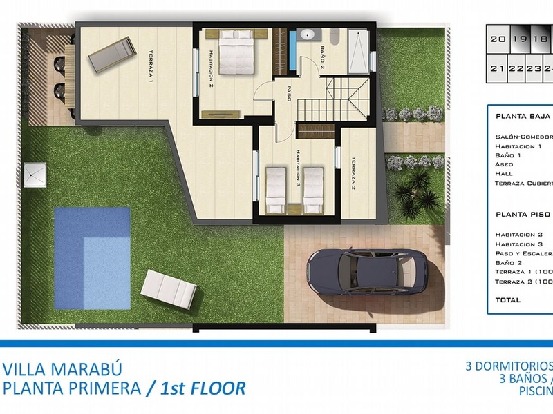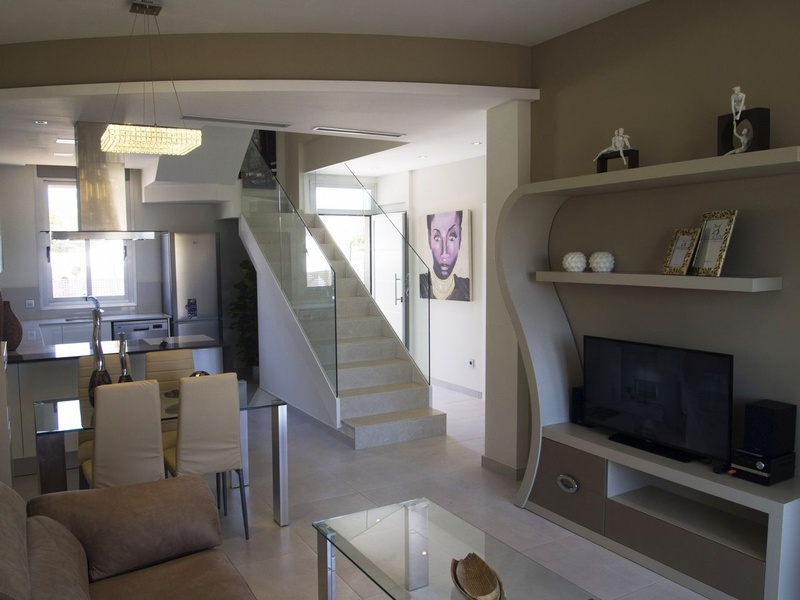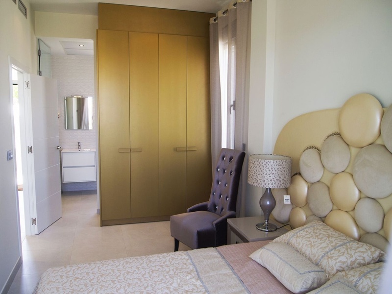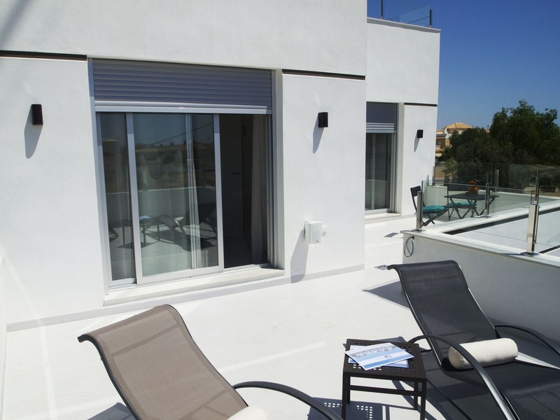 Property details • Type: Luxury Villa • For sale/for rent: For sale • Province: Alicante • Town: Rojales • Area: Lo Marabú • Bedrooms: 3 • Bathrooms: 3 • Living area: 132 m² • Plot size: 200 m² • Type of property: New build Extras • Built Year: 2015 • Kitchen: American - Equipped • Living Room Size: 33 m² • Nº Toilets/Shower: 1 • Balcony: Open terrace - 25 m² • Orientation: Southeast • Swimming Pool: Private • Heating Type: Under floor heating - Individual • Water heater: Electric - Individual • Garden: Private - 182m² • Parking: Yes • Shutters: Anodized aluminum • Property floor: Ceramic • Reinforced Door: Yes • Air Conditioning: Yes • Fitted wardrobes: Yes • Double glazing: Yes
