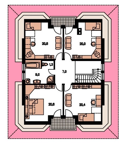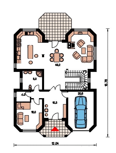 Интерьер 327,3 м2, площадь застройки 172,8 м2, сад 2 016 м2, участок 2 189 м2.