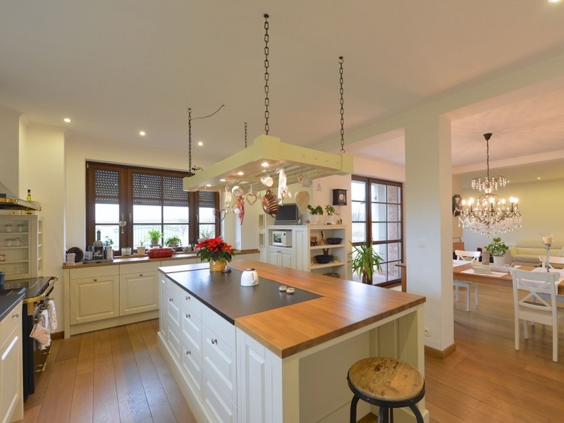 Первый этаж дома состоит из гостиной с камином, кухни и французскими окнами, ведущими в сад, далее домашнего кабинета/спальни, ванной комнаты с ванной, душем, двумя раковинами и туалетом, а также прихожей, через которую можно пройти в гараж на один автомобиль. Верхний этаж состоит из 4-х спален, ванной комнаты с ванной, душем, двойной раковиной и туалетом, а также лестничного холла. Оснащение дома включает в себя массивные деревянные полы, деревянные окна и межкомнатные двери, полностью оборудованный кухонный гарнитур, центральный пылесос Husky, систему безопасности, половое отопление тепловым насосом. В саду размещены подогреваемый бассейн RivieraPool и резервуар для дождевой воды объемом 13 м3.
