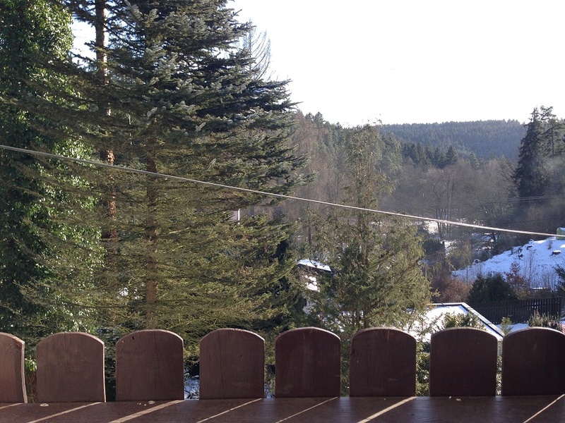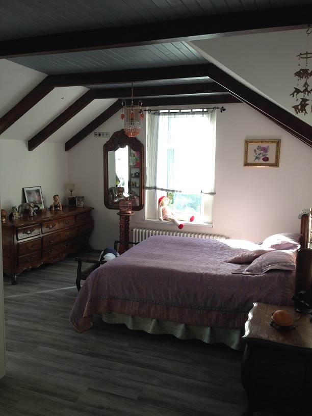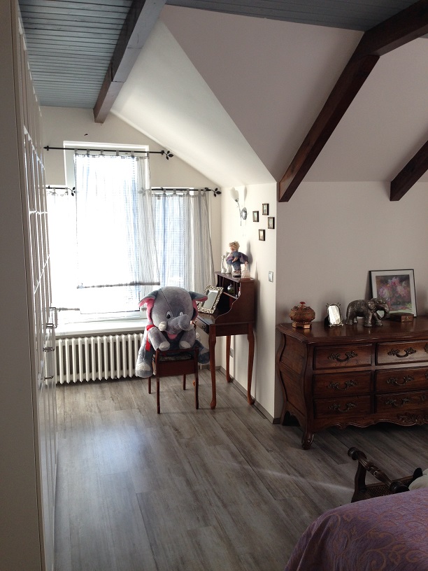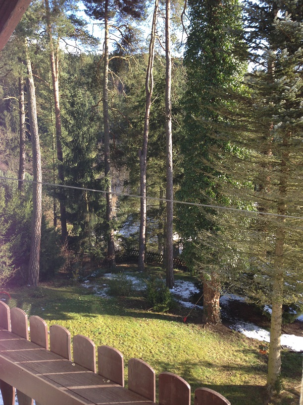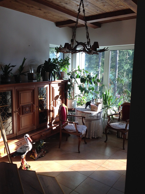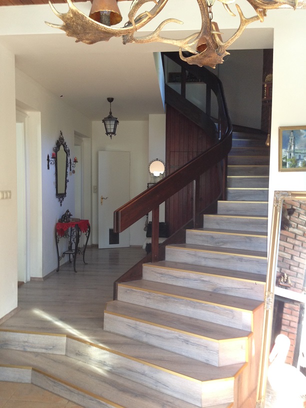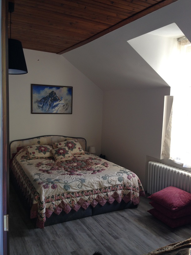 Далее, по удобной широкой лестнице поднимаемся на второй этаж, где находится санузел с душевой кабинкой и три комнаты- большая спальня 17,6 м2 с балконом 10 м2, открывающим вид на столетние сосны, меньшая комната 16 м2 и спальня 27.5 м2 с собственной ванной комнатой с джакузи и небольшим балконом 2.5 м2 с видом на лес и долину. На этом этаже оборудована прачечная, вмещающая в себя стиральную и сушильную машины и склад моющих средств и разных мелочей, необходимых в хозяйстве.
