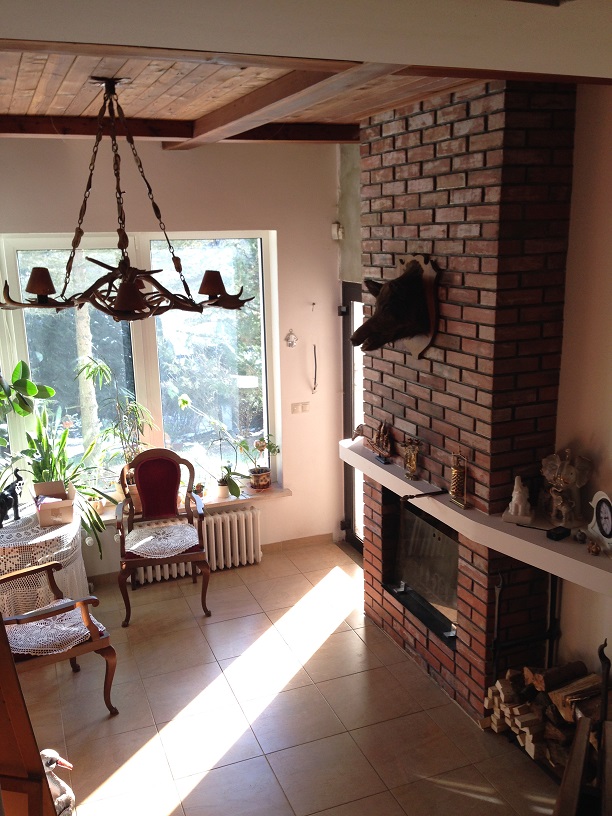 Первый этаж: просторная прихожая с окнами во всю стену и видом на лес и выполнена в стиле охотничьего домика. Камин, находящийся здесь, подчёркивает непередаваемую атмосферу.