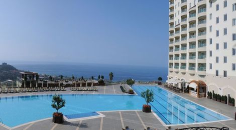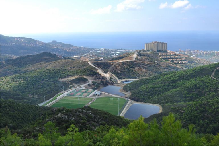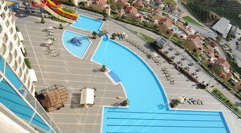 Этот невероятных размеров жилой Комплекс и Отель уровня 5 звезд возведен в живописной местности, на холме в Алании.