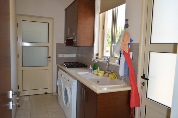 Слева от дома находится встроенный гараж на две машины. Из гаража есть доступ в подсобное помещение и оттуда на кухню.