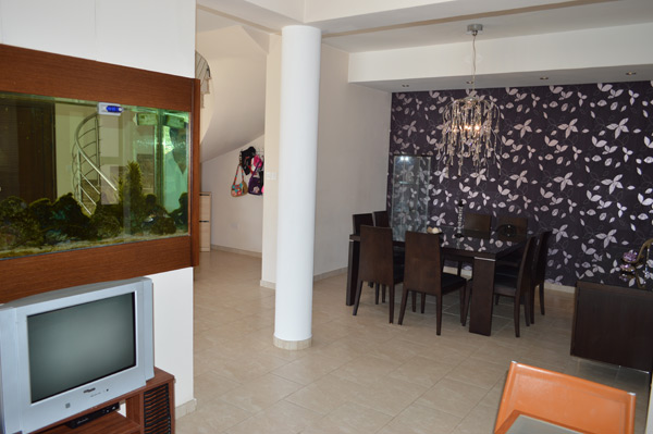 Далее располагается столовая, отличающая интересной деталью – большим аквариумом, встроенным в одну из стен. Большая кухня открытого плана примыкает к столовой.