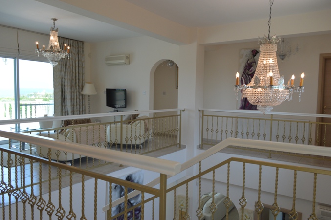 Мраморная лестница ведет наверх на великолепную галлерею, где была оборудована зона для отдых и чтения, где вы можете наслаждаться панорамным видом на море.