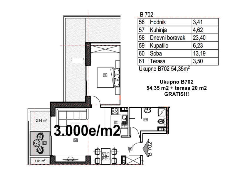 Apartment overlooking the mountains and the city, with one bedroom. Total area 54.35 sq.m + terrace 20 m2 with landscaping as a gift!
