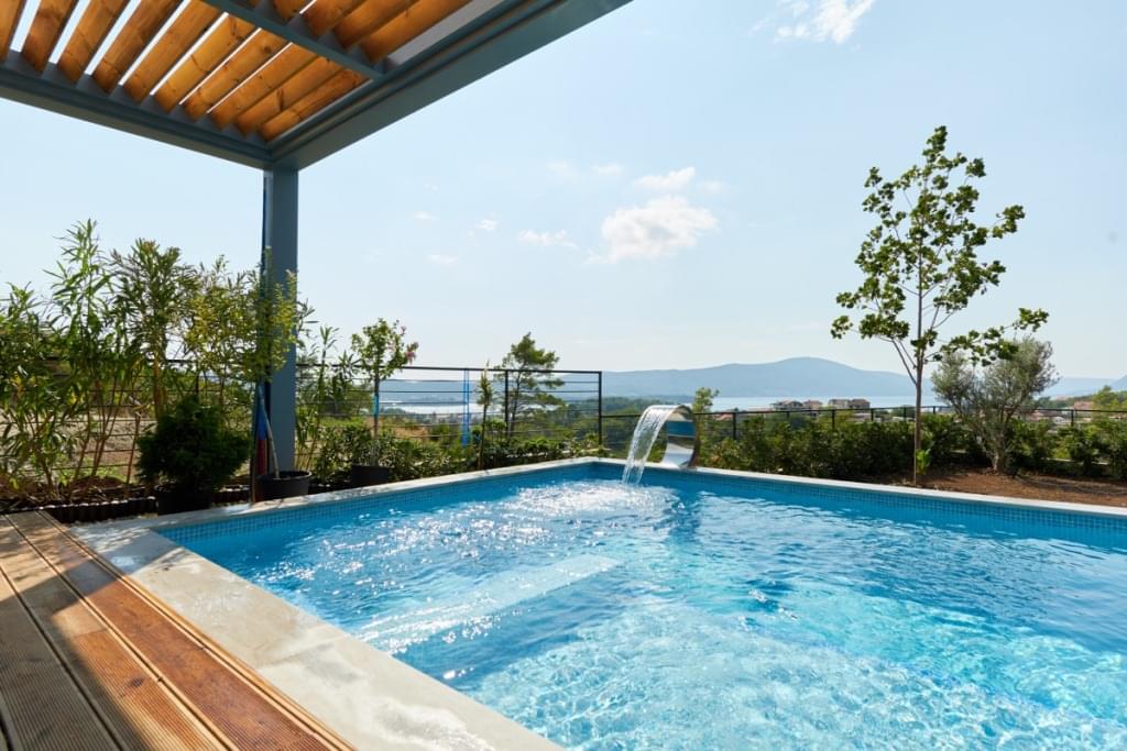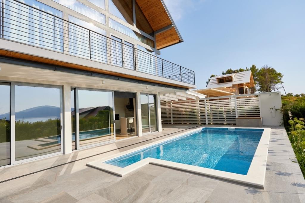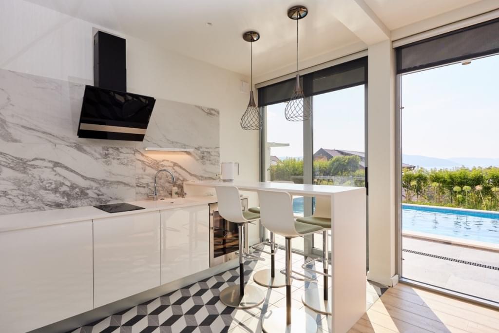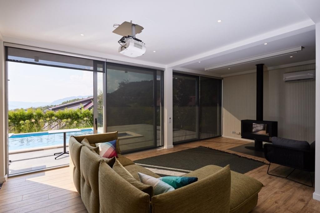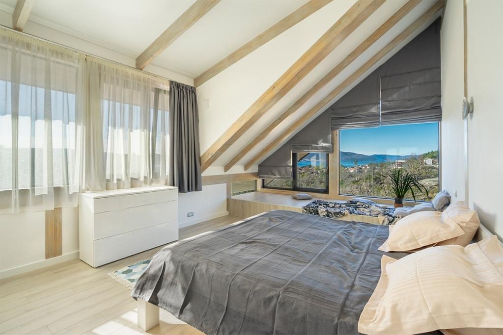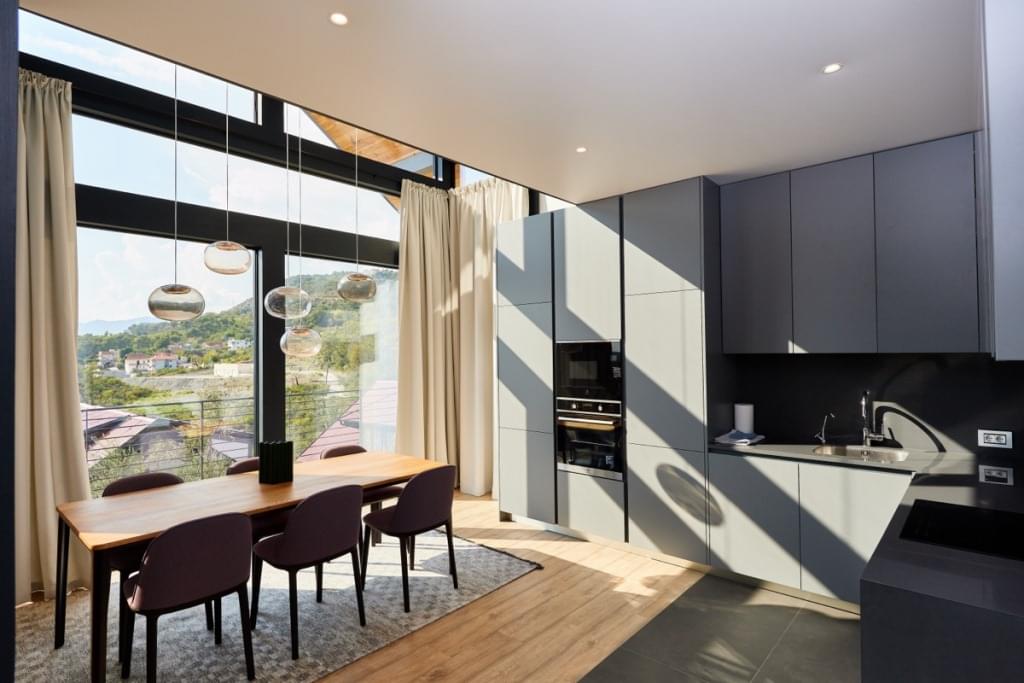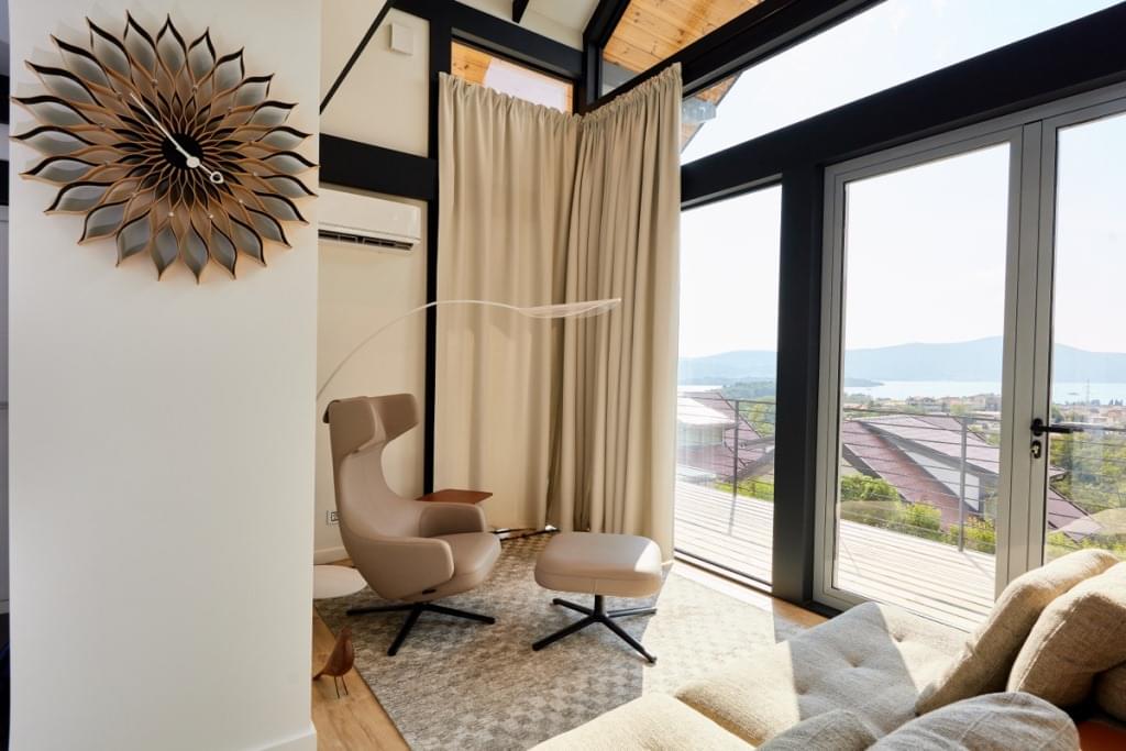 Дом состоит из двух отдельных апартаментов. Каждые апартаменты включают гостиную с кухней, спальню, ванную комнату и террасу с замечательным панорамным видом на море и лес.