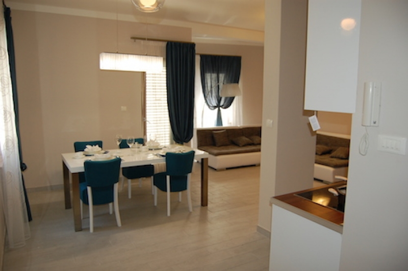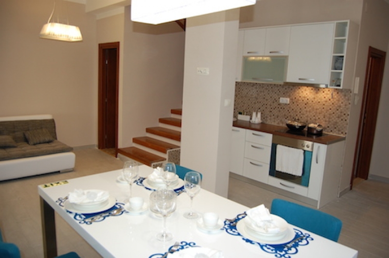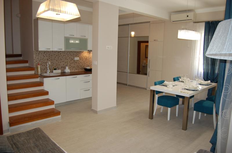 Двухуровневые апартаменты расположены на двух верхних этажах нового жилого комплекса в Рисане. Комплекс обслуживается управляющей компанией. Общая площадь апартаментов составляет 145 м2.