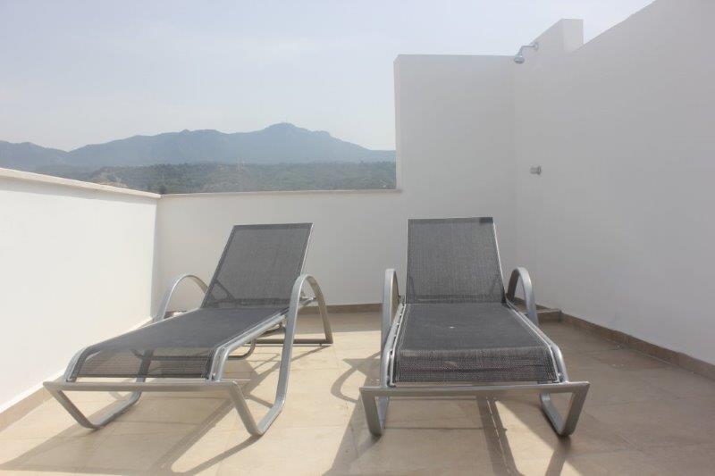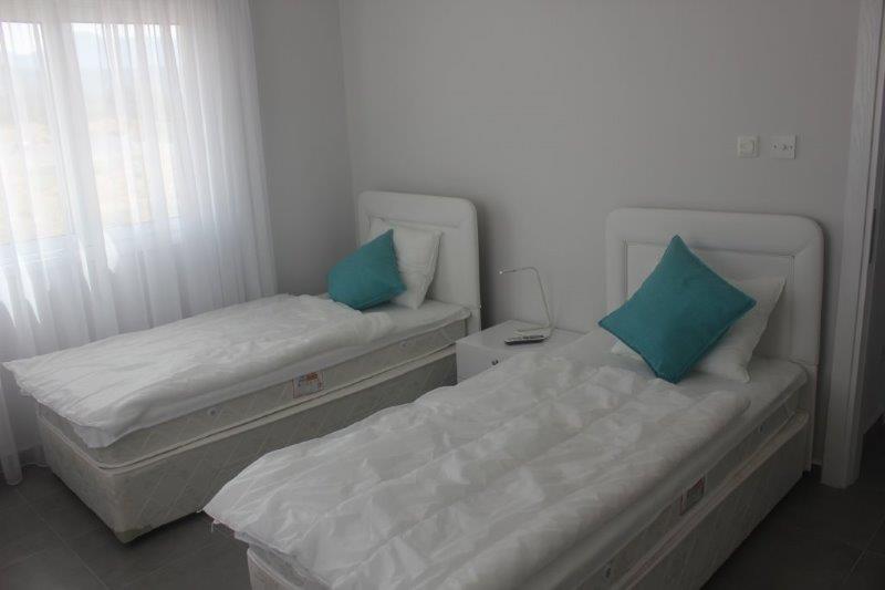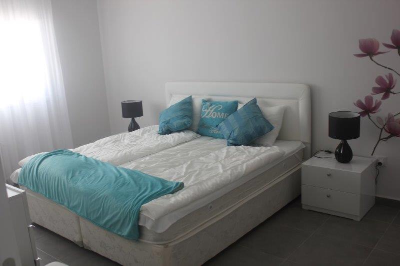 Это абсолютно новая просторная 3-х спальная квартира в потрясающем месте с видом на море и горы с большой террасой. Имеет 6 спальных места. В одной спальне большая 2-х спальная кровать ( имеет приватную ванную комнату) и две спальни имеют 2 односпальные кровати.