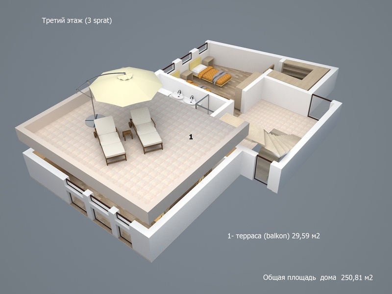 Двухэтажная вилла площадью 250 кв. метров выдержана в классическом стиле юга — белоснежные фасады (в их отделке использован природный камень), большие окна, просторная, 30 кв. метров, терраса на верхнем этаже, с которой открываются прекрасные панорамы моря и гор.