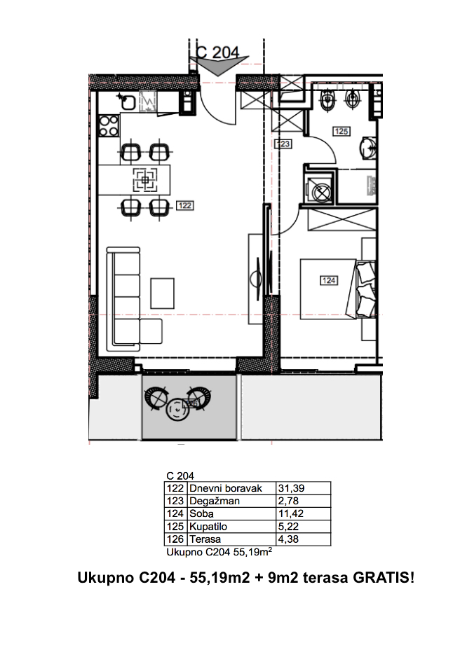 1-bedroom apartment number C204 in an exclusive multi-complex «Porto Budva» with a shopping center of 8000 sq.m and a