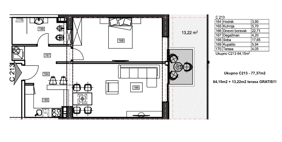 1-bedroom apartment № C213 on 2 floor ( high 4) , total area 64,15 м2  + 13,22 m2  terrace with landscaping as a gift in an exclusive multi-complex «Porto Budva» with a shopping center of 8000 sq.m and a SPA-center 3500 sq.m with a wide range of services, with the medical center, with indoor and outdoor pools!