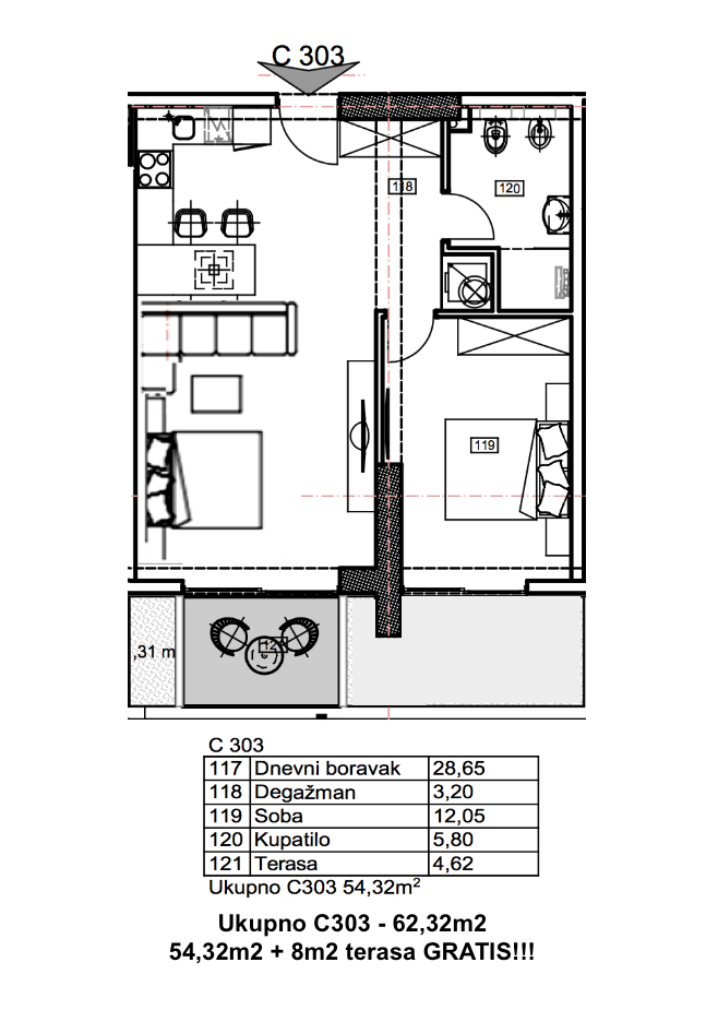 2-bedroom apartment number C303 in an exclusive multi-complex «Porto Budva» with a shopping center of 8000 sq.m and a SPA-center 3500 sq.m with a wide range of services, with a conference hall and a restaurant, with indoor (20mx8mx1.8m) and outdoor pools (28mx20mx1.8m)!