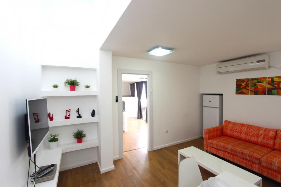 Небольшой салон вмещает в себя кухонную мебель со встроенной бытовой техникой и всем необходимым для приготовления пищи, зону отдыха с раскладывающимся диваном и телевизором с кабельным телевидением с русскими каналами, большой совмещённый санузел с душевой кабиной и выход на балкон, где установлена стиральная машина и машина для сушки белья.