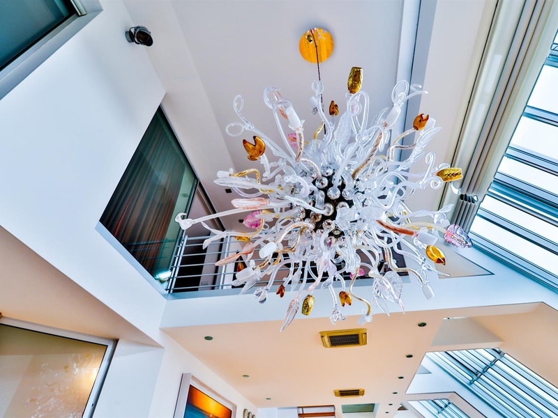 Интерьер характеризуется сочетанием современных, чистых линий и оригинальных элементов в виде стильной мебели от известного итальянского бренда Минотти, а также аксессуарами, картинами, скульптурами, люстрами, светильниками и другими сокровищами от востребованных чешских и зарубежных художников.