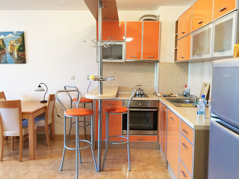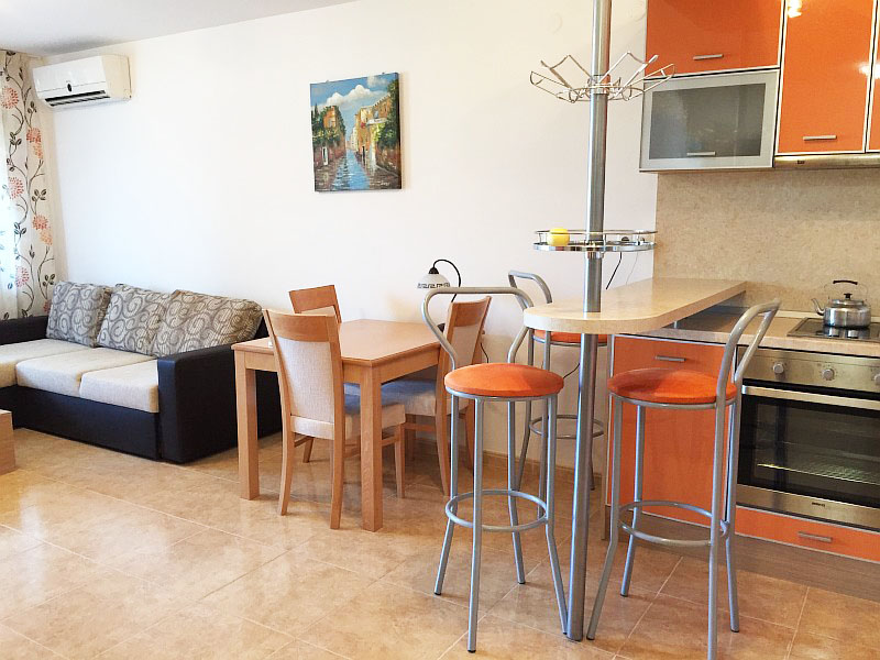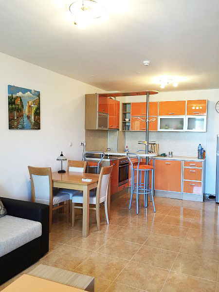 Sie verfügt über 2 Zimmer: ein Wohnzimmer mit Küche und ein Schlafzimmer. Im Wohnzimmer gibt es Schlafsofa, Kaffeetisch, TV-Schrank mit TV-Gerät, Esstisch und Küchenzeile mit Kochplatten, Backofen, Dunstabzugshaube, Kühlschrank, Waschmaschine. Im Schlafzimmer gibt es Doppelbett, großen Kleiderschrank und Kommode. Die Wohnung verfügt über eine Terrasse mit fabelhaftem Ausblick auf das Meer.