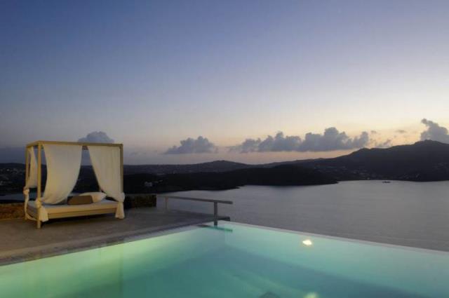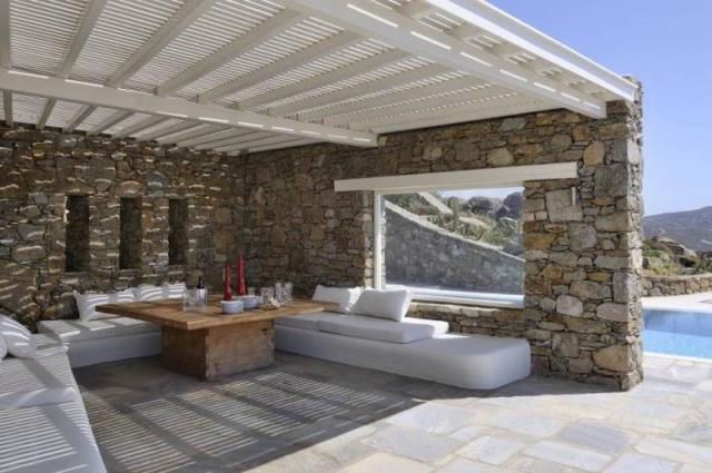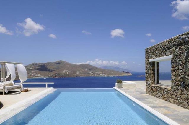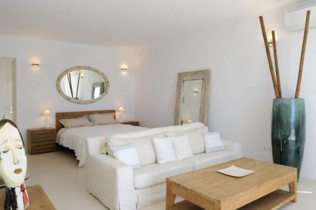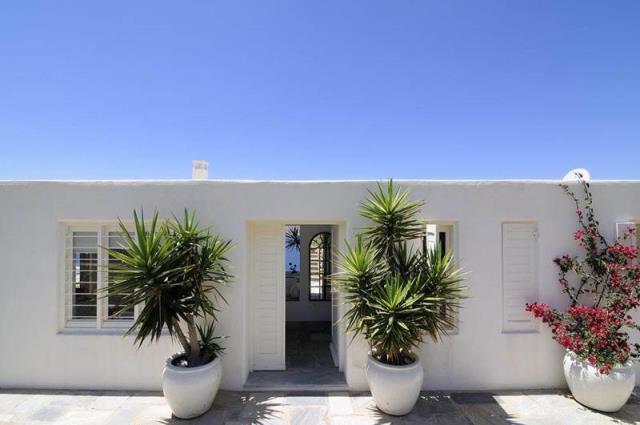 Rent a luxury villa on the island of Mykonos Greek island, one of the islands of the Cyclades, is located in the central part of the Aegean Sea, the coastline of which reaches 89 kilometers. Closest to him of the island - Andros, Tinos and Delos. The house is located on uchpstke 8000 m ², which is surrounded by a stone wall and consists of 4 independent guest houses and a small stone bedroom with bathroom next to it. On the upper level there is a central guest house, as well as a gazebo and a swimming pool (14x5.5 m), sitting area around it with sunbeds and barbecue. Central apartment (top floor) is approx. 75 m² with the master bedroom, which has a magnificent view, a spacious marble bathroom, a fully equipped kitchen, dining room and living room. Through the open stairs, get into the other 3 guest houses on the second level. Central apartment of approx. 85 m², 1 Bedroom, living room, bathroom, kitchen with dining room and a separate area with two single beds. Next to that a smaller apartment with a living area, a bathroom and 2 single beds. On the other side of the central guest house has a large suite approx. 55 m² with a bed and bathroom, as well as a seating area. The house overlooks the sandy beaches of Panormos and Agios Sostis. Beaches are very close, about 10 minutes, you can always use the pool, equipped with 8 chairs, a double sun bed and a comfortable sofa, a parking place for 5-6 cars. Twice a week cleaning of the pool and we provide daily cleaning service at 4:00, other services can be transmitted on request, such as boat rentals, private chef, etc .. Please keep in mind that we offer concierge, private chef and private driver services on request; Early booking is recommended, landing from the airport or the port can also be arranged. House total area is 380 sqm, land 8000 sq.m .. The distance to the airport 17,20 km.