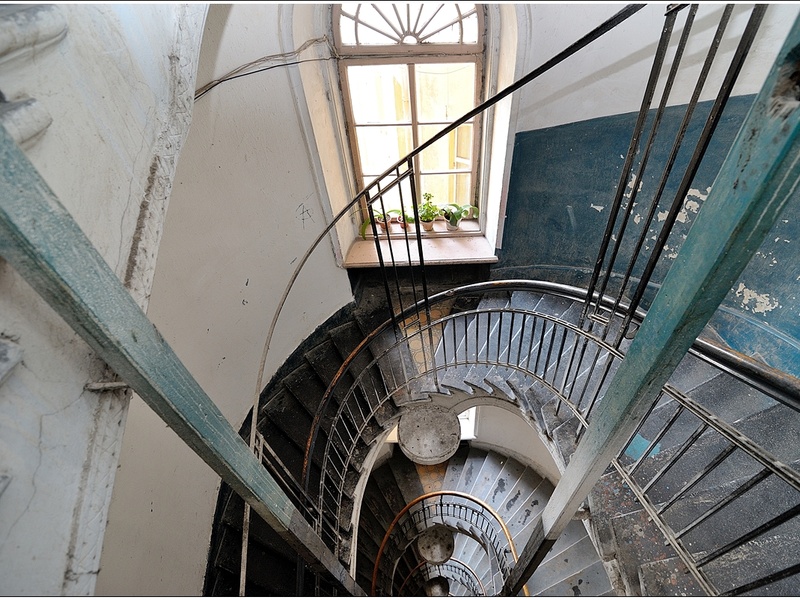 The main facade of a residential house – modern style. Facade 6 floors; symmetrical composition far aggregated proportions. Two floors of the lower trim uniform, large windows, shop, second floor – Modern typical bevelled upper corners. III – IV floors connected by 3 bay windows in the facade of the middle and sides; between-bay insert balconies. IV floor, separated by a continuous cornice and balcony, is completed as much as a stepped parapet with a recorded date of construction, which in 1914 was built by Count Sergei Łopaciński. The facade is decorated granite simulating plaster, plinth part (bottom two floors) – polished black gabbro plates which are reinforced with metal beams.