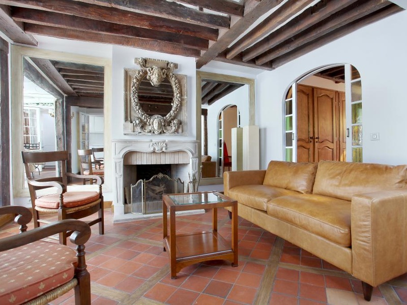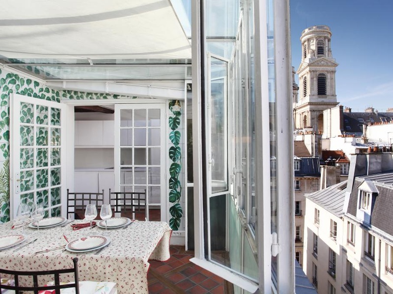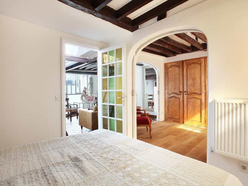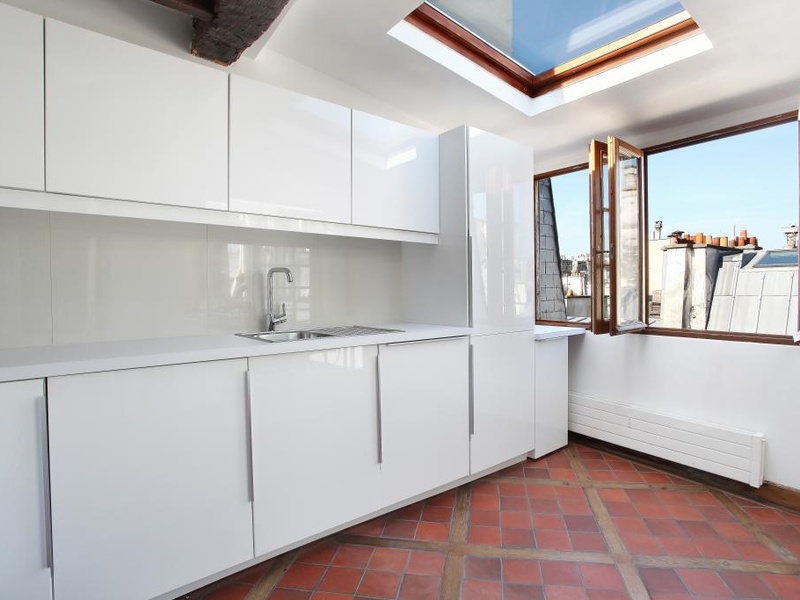 On the first level is a bedroom of 7 m2; on the second level living area 17.34 m2, 10 m2 equipped kitchen, dining room 12,38 m2 with stained glass windows and roofed bedroom 16 m2. The apartment is very bright, with a southern exposure, has a magnificent view of the church of Saint-Sulpice and Saint-Germain-des-Prés, which makes it a rare and special.