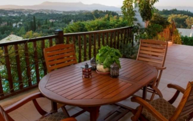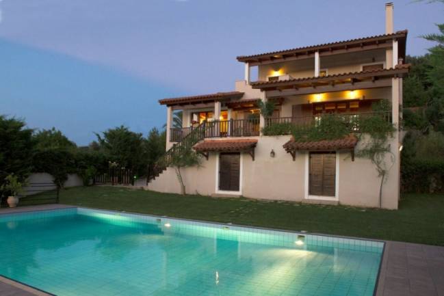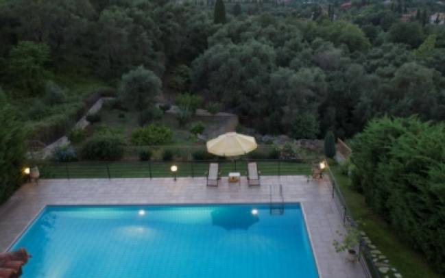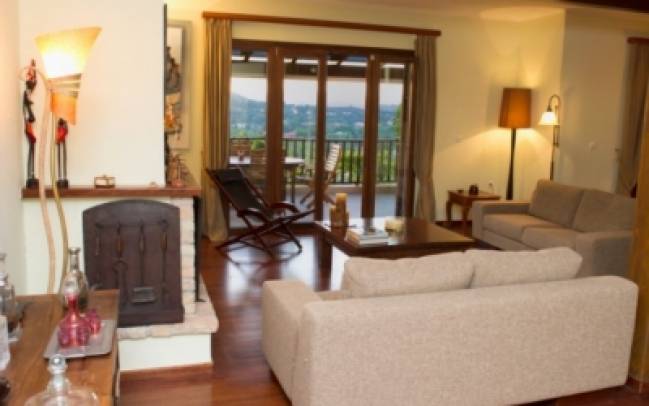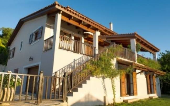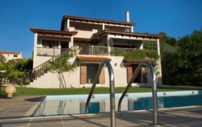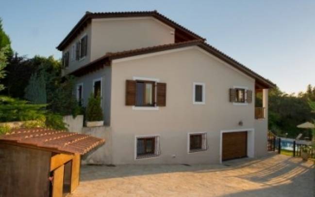 Villa for sale in the eastern part of Corfu (Gastouri Area) Greek island, the northernmost and second largest (593 sq km), among the Ionian Islands. The villa has 345 square meters, was built in 2008, on a fenced plot of 2100 square meters, about 5 km from the international airport and the island's capital. Built among olive trees Venetian era, on 2 floors with panoramic views of the turquoise waters of the Ionian Sea and the lush countryside of Corfu, and also includes a detached guest house of 50 square meters, large garden with fruit trees and a spectacular swimming pool. On the ground floor there is a living room with fireplace, dining room and functional open plan fully fitted kitchen. At this level there are two bedrooms, dressing room and bathroom, while upstairs there are 2 large bedrooms, a bathroom with a large bath and a cozy lounge. All rooms have large balconies and beautiful floors. There is a separate entrance to the pool and a garage that communicates through a door on the first floor of the house. In addition, there is a large area for storage of huge ancillary facilities. The villa is located 3 km from the picturesque island of Mouse and sold with luxury furniture or not.