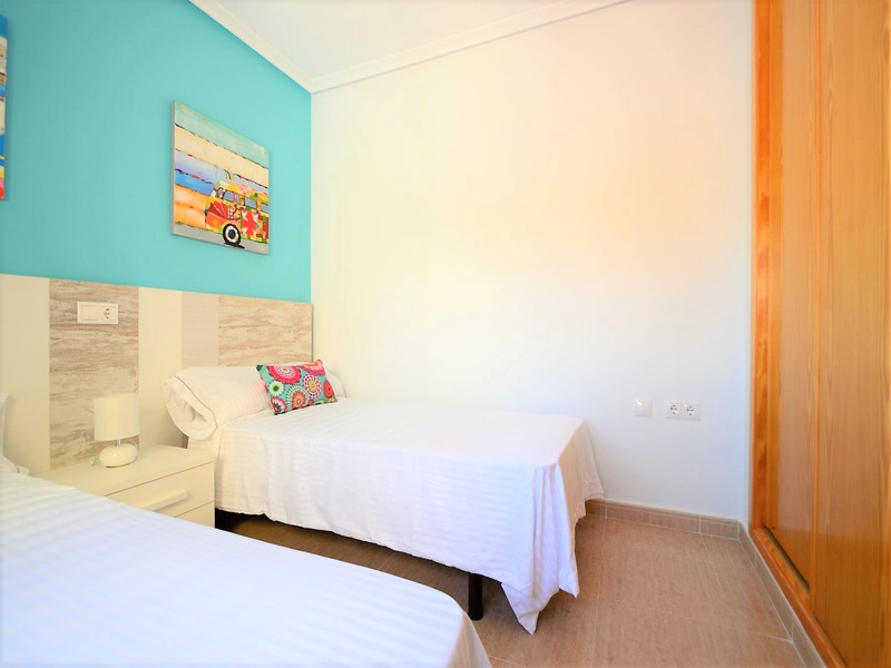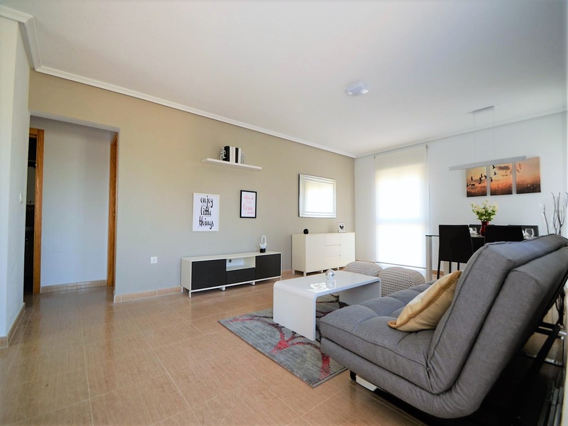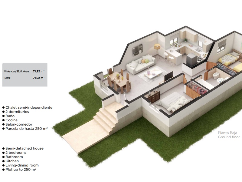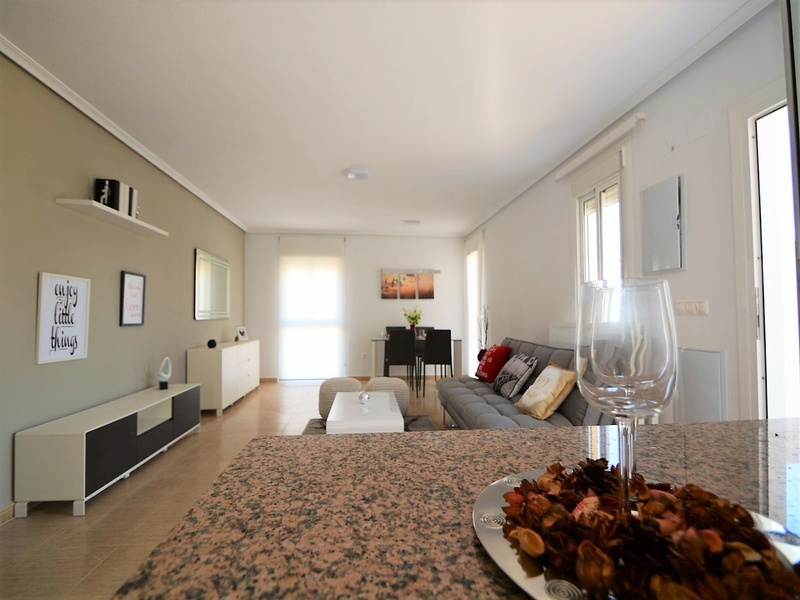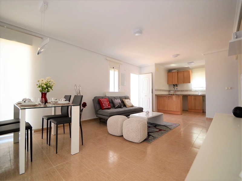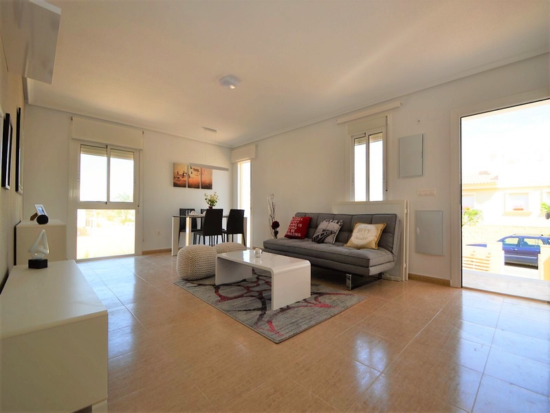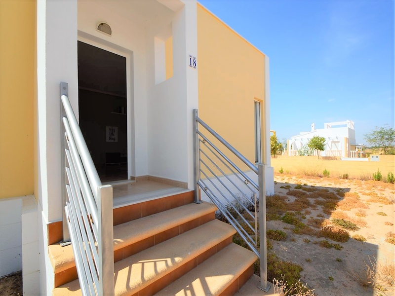 2-bedroom semi-detached villa with a modern design. It has 2 bedrooms, 1 bathroom, a kitchen and a living room. The built surface area of 68,76 square meters and a plot of 150,36 square meters of private gardens. The villa has built-in wardrobes, kitchen and bathrooms are fully equipped, aluminum windows, shutters, pre-installation of communications for air conditioning and solar panels. The property is located in an area with natural landscapes, adjacent to the golf courses. In close proximity to all the amenities possible and magnificent beaches of Costa Calida and Costa Blanca.