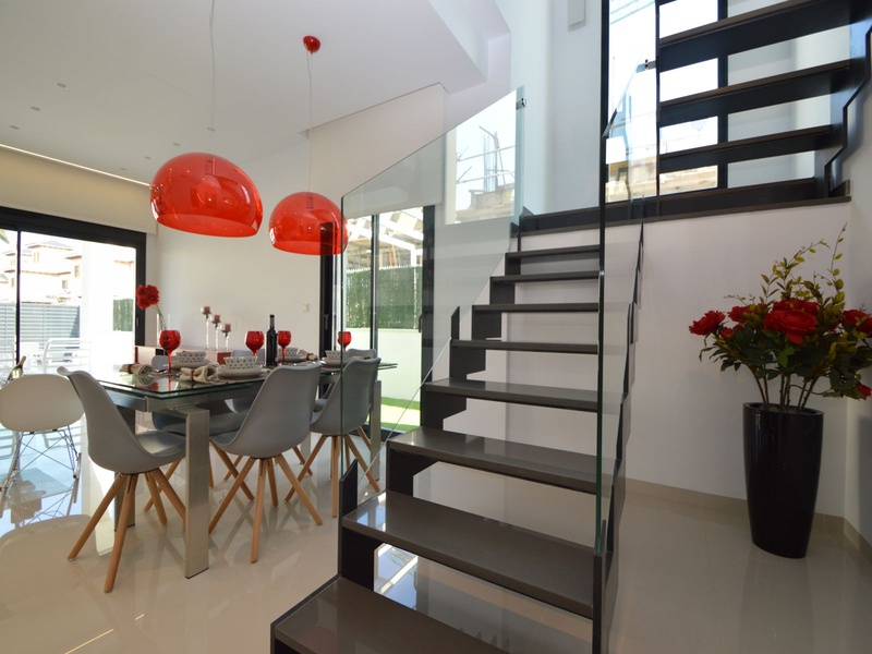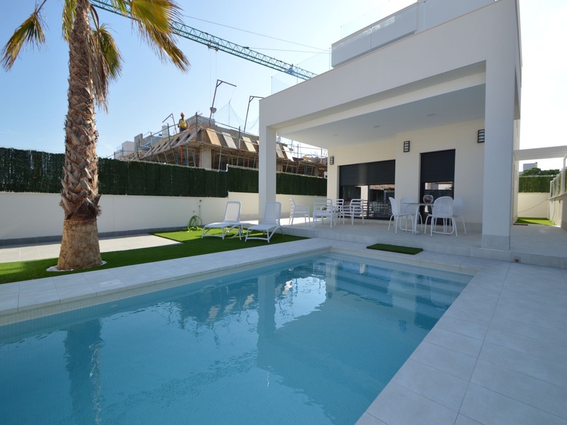 A private modern house. New build property, high quality construction and finishing materials. Energy Efficiency class B. The villa has a built surface area of 163.35 square meters, distributed between two floors. It has a large porch, a living room, a kitchen, 1 bathroom, a laundry room, a storeroom and 1 spacious bedroom with a private dressing room on the ground floor, and two large bedrooms with private dressing rooms and bathrooms on the first floor, plus the master bedroom has a large terrace with a surface area of 31.96 square meters. The house also disposes of a solarium with a surface area of 49.70 square meters. It is located on a plot with surface area of 348.26 square meters, covered with a garden, with a private pool and a parking space for one car. Thermalt and acoustic insulation, waterproof walls on the out side, armored entrance door, motorized blinds with independent ventilation, aluminium double glazed windows, fully furnished and equipped kitchen, bathrooms and laundry are also fully equipped, air conditioning with an individual machine for each floor, solar water heater, pre-installation of acclimatization of the pool, automatic irrigation system. 350 meters from the beaches of La Marina and El Pinet, consisting of soft golden sand that stretch for almost 3 kilometers along a strip of impressive natural dunes, next to a large pine forest and the Salinas del Pinet. These beaches dispose of blue flags, coastguards, restaurants by the edge of the sea, and a sports station that offers a variaty of water activities. The area has all the amenities possible, it is located 13 kilometers from Elche, 20 kilometers from Torrevieja and 25 kilometers from Alicante.