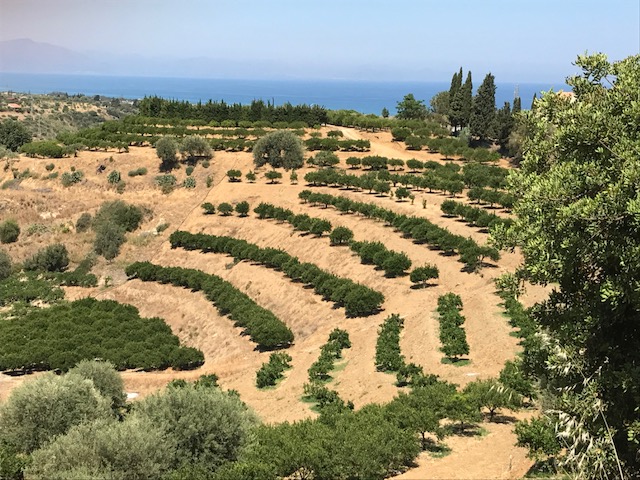 A springwater and electricity are on the ground. So is a water pipeline system a watering the 600 olive- and citrus trees.