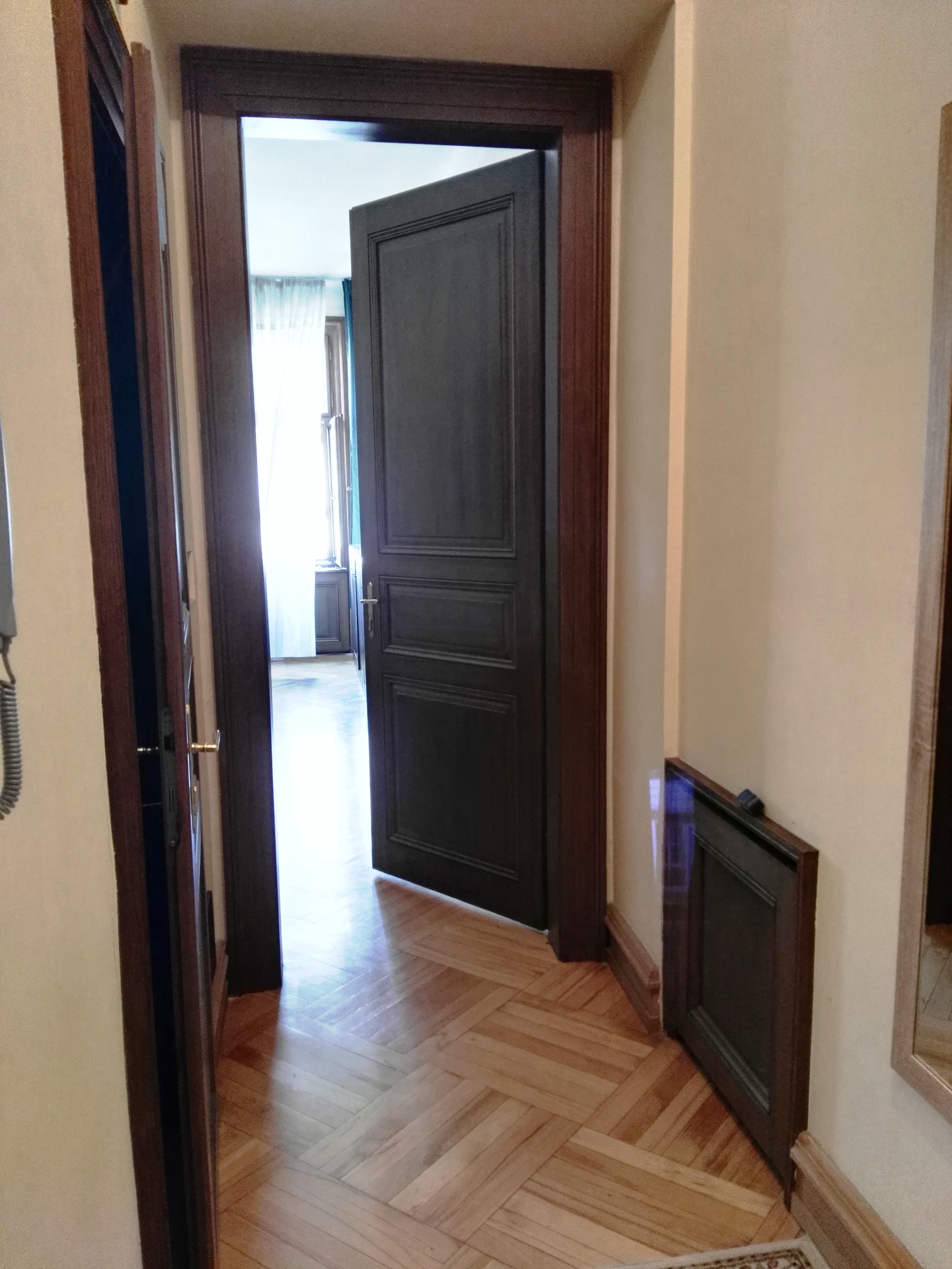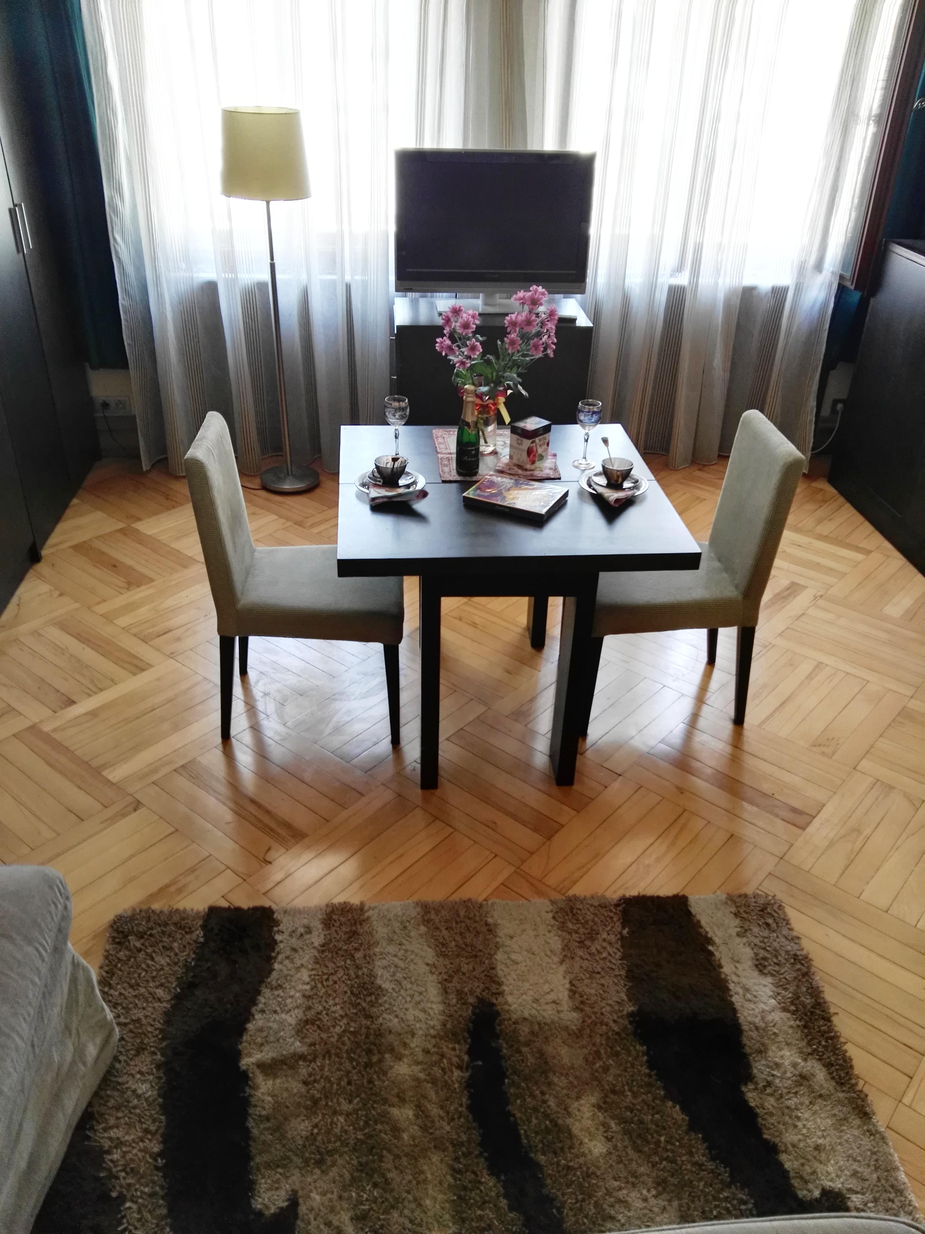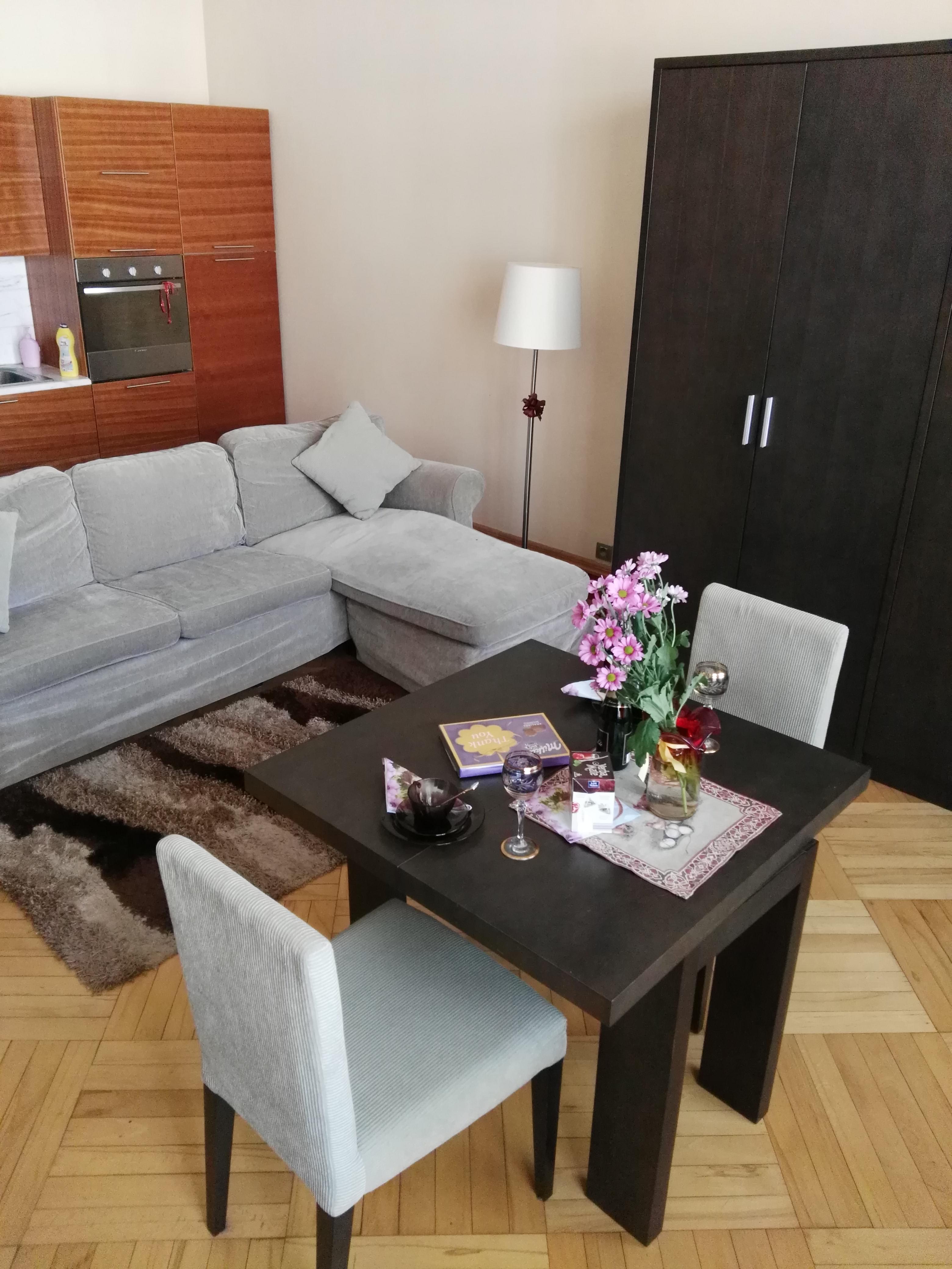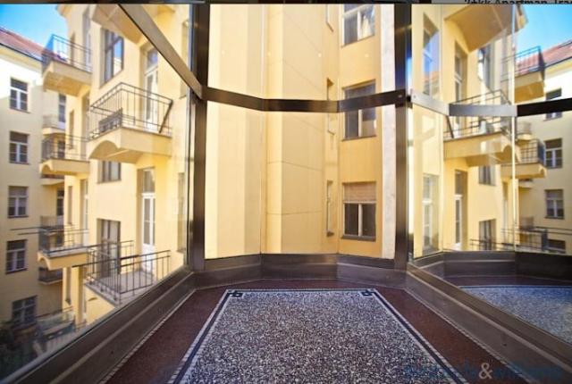 Дворец "У двух щитов" располагает на каждом этаже двумя квартирами, отличающихся расположением и размером, площадью приблизительно 51 м2 и 98 м2. Квартирa 2+кk находится по правой стороне дворца переднего вида и состоит из: просторного коридора, спальней влево и сразу ванной из белого мрамора с душевой и с котлом для отопления. Продвигаясь далее по коридору, обнаружим просторную комнату с кухней, полностью оборудованной современной электронной бытовой техникой. Окна, находящиеся на передней стороне дома выходят на улицу. Вся квартира полностью оборудована.