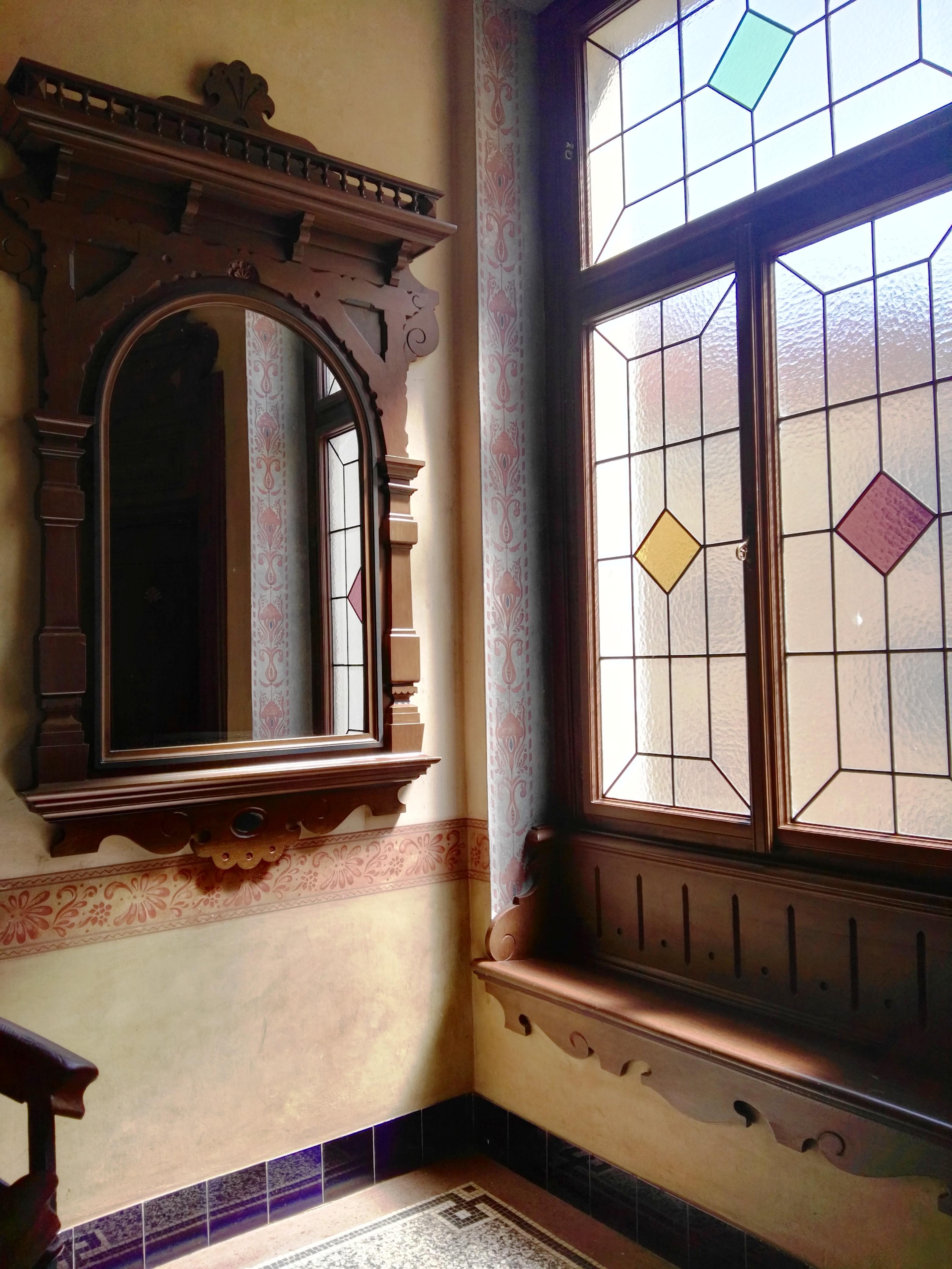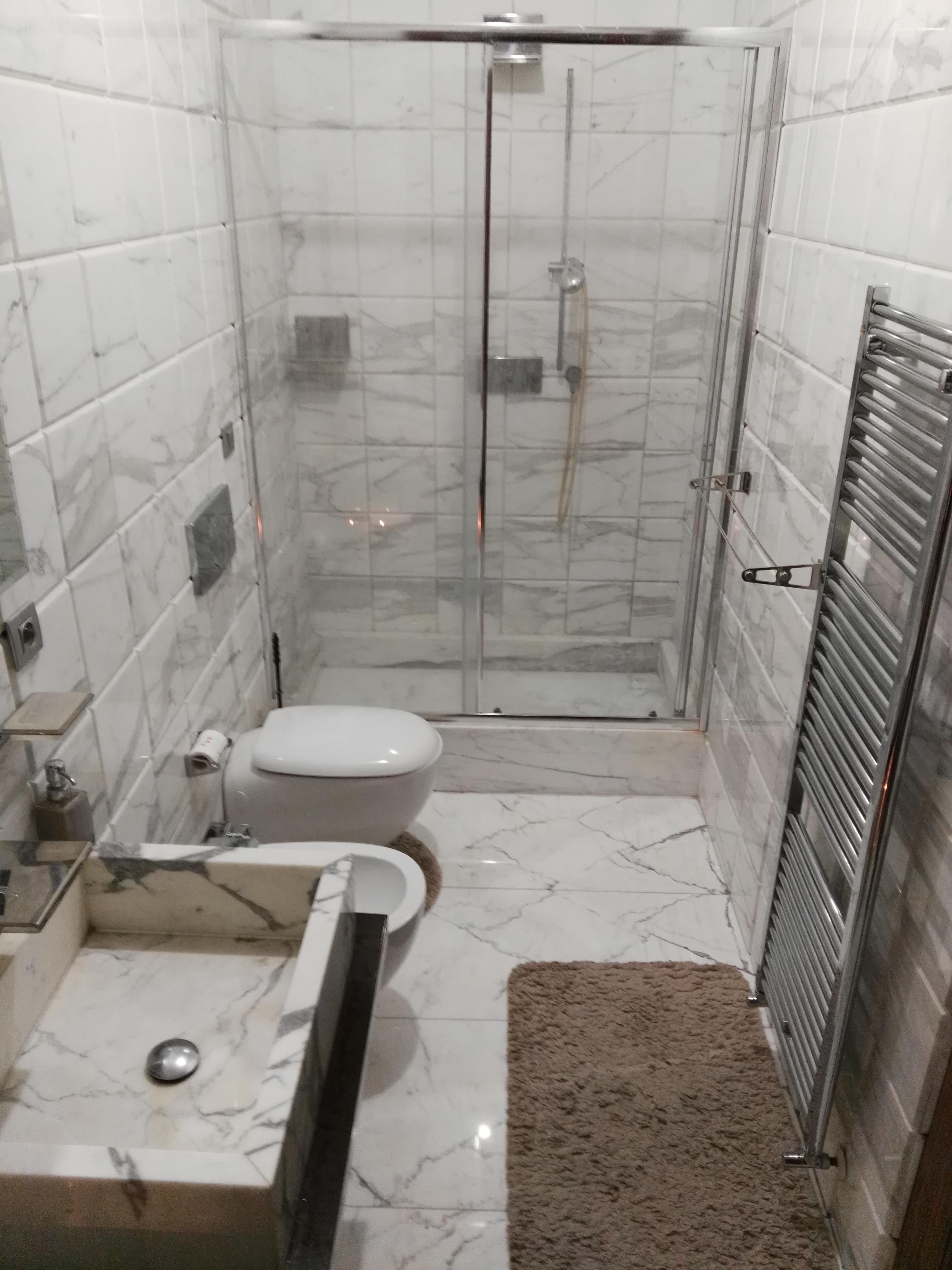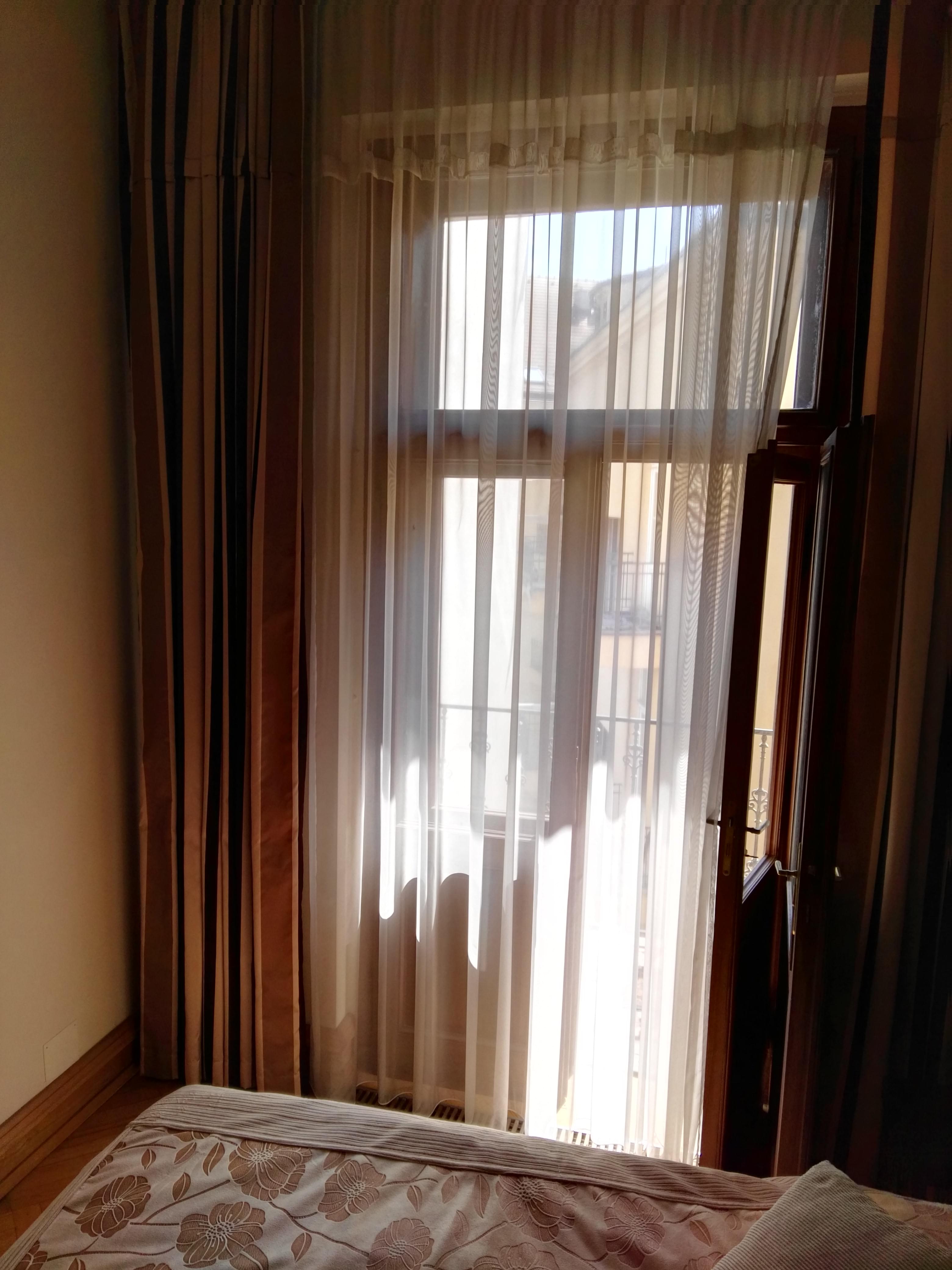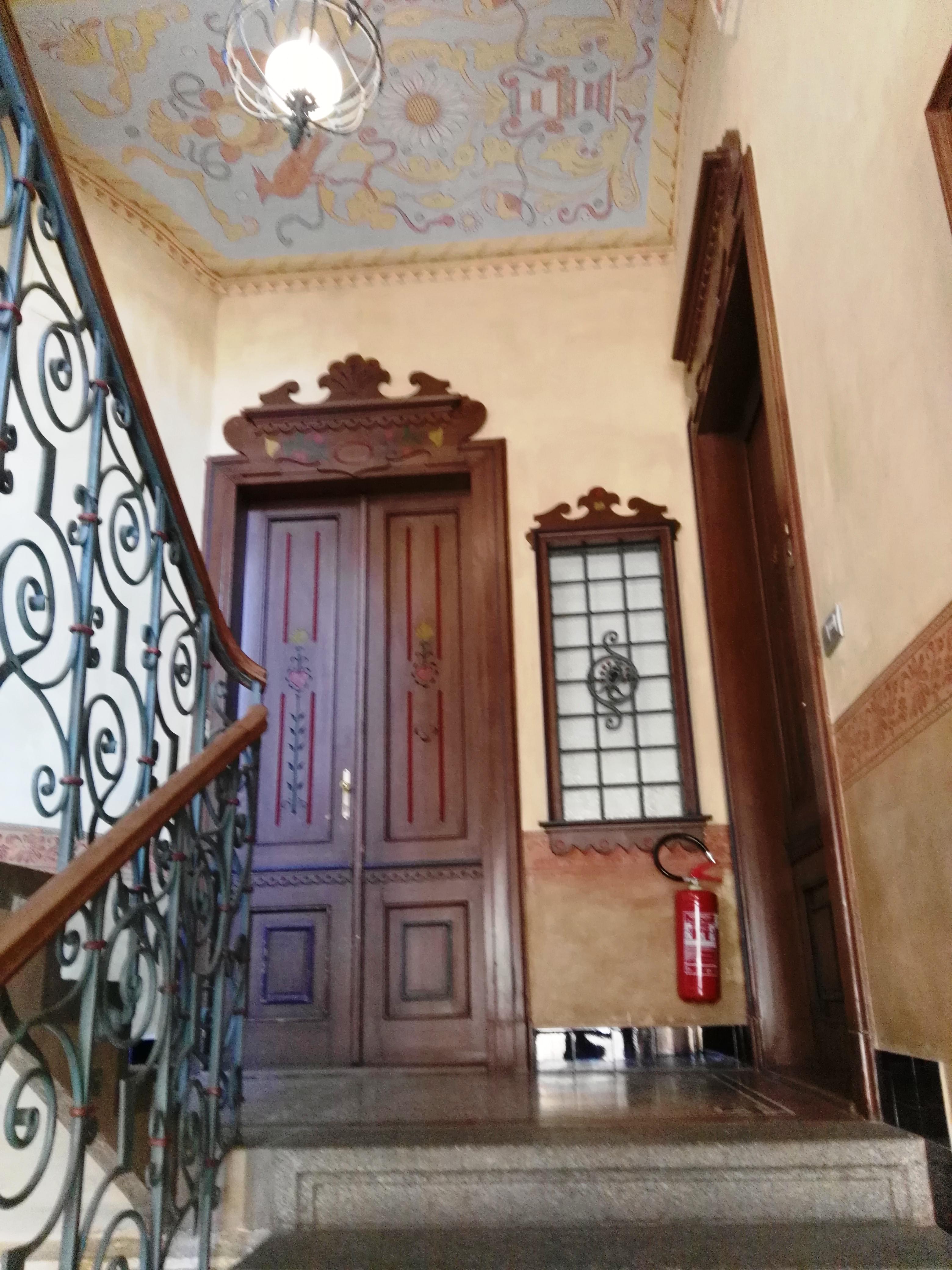 Дворец "У двух щитов" располагает на каждом этаже двумя квартирами, отличающихся расположением и размером, площадью приблизительно 51 м2 и 98 м2. Квартирa 2+кk находится по правой стороне дворца переднего вида и состоит из: просторного коридора, спальней влево и сразу ванной из белого мрамора с душевой и с котлом для отопления. Продвигаясь далее по коридору, обнаружим просторную комнату с кухней, полностью оборудованной современной электронной бытовой техникой. Окна, находящиеся на передней стороне дома выходят на улицу. Вся квартира полностью оборудована.