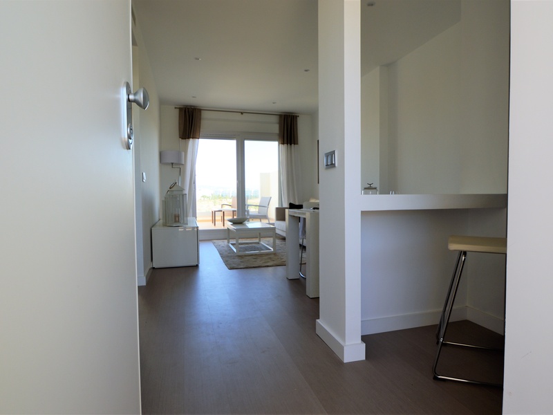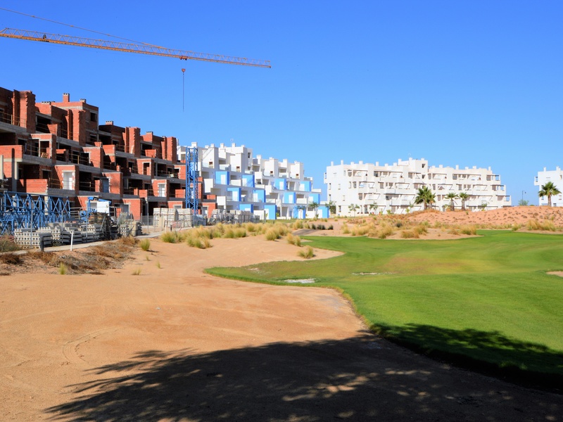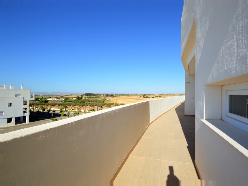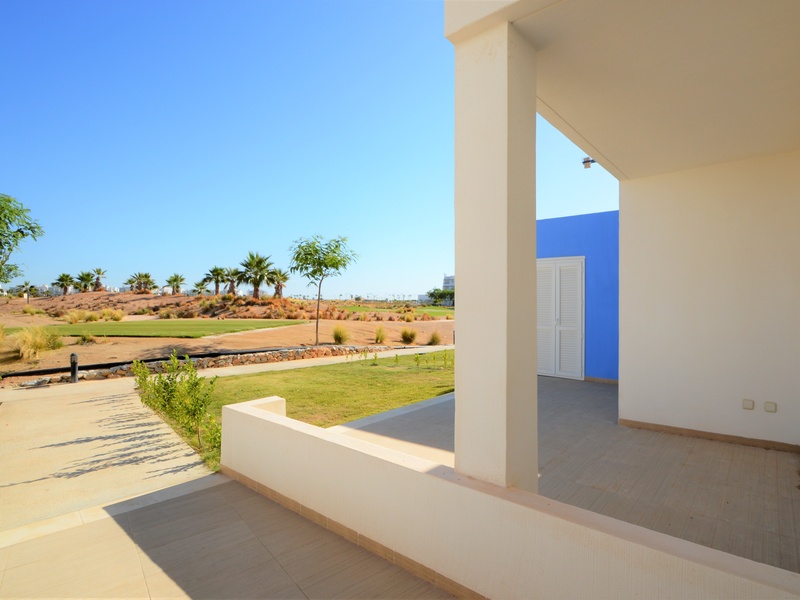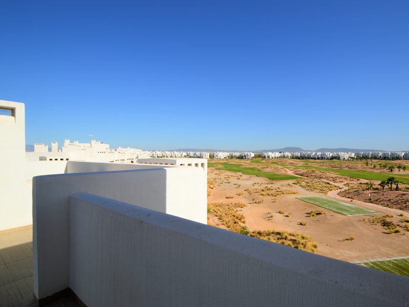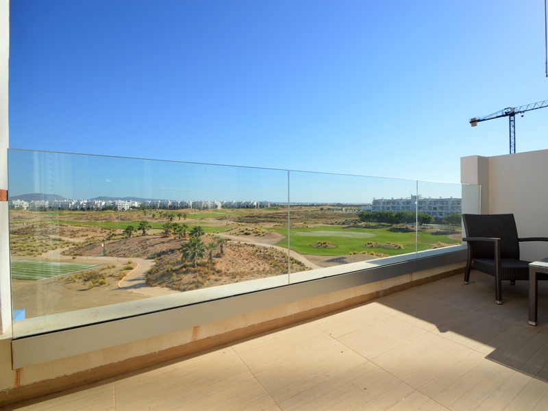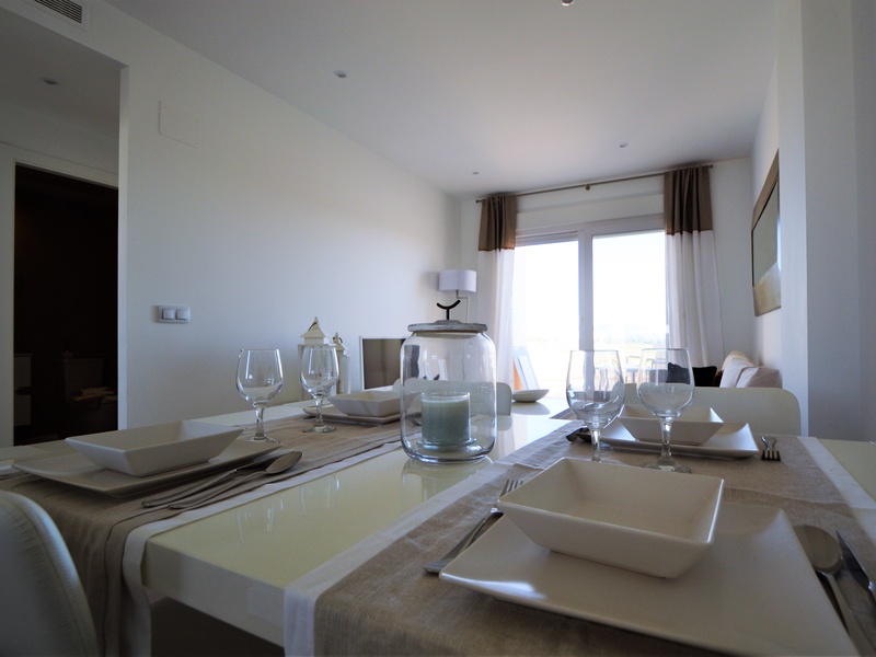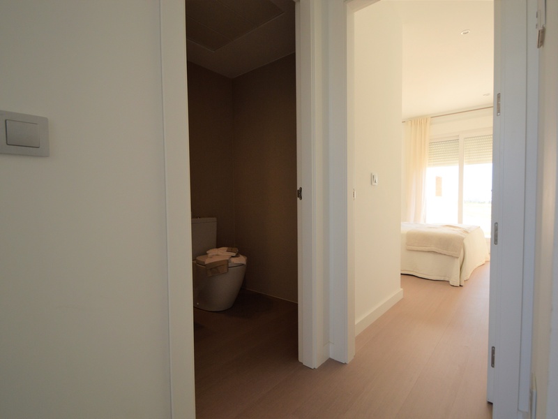 Brand new 2 bedrooms apartment for sale on the first line of the golf courses Las Terrazas de La Torre. With a total built surface area of 85,80 square meters which includes a terrace of 18,10 square meters. The apartment disposes of 2 bedrooms, 1 bathroom, a living room, a kitchen and a parking space. With the kitchen and the bathroom fully furnished and equipped, with air conditioning by ducts, armored entrance door and fitted wardrobes in both bedrooms. The double orientation of the apartment makes it very bright and provides with unique views to the golf courses from all the windows. The apartment is located in a building that forms part of a private residential complex with communal swimming pools, an outdoor parking and a solarium. The complex is located inside the golf resort with 24 hour surveillance and all services within the resort. The price of the apartment described is 99,900 € and there are 5 properties left for sale of the same type and at the same price. In total there are 19 apartments for sale of new construction that will be finished in September of 2017. The photos correspond to the showhouse.