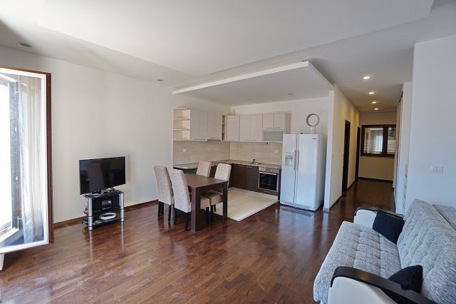 A spacious 59 m2 apartment is located in the heart of Budva in the modern complex “Luzitanos”. There is a courtyard, an underground garage, 24 hour security, video surveillance, central heating and air conditioning. Every apartment is provided with the central hot water system and climate control. The apartment is facing a nice river Grdgevica and is 250 meters from the sea.