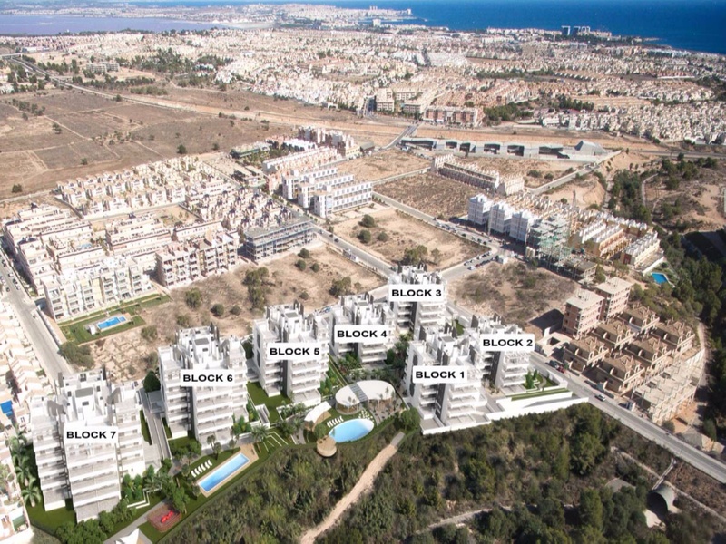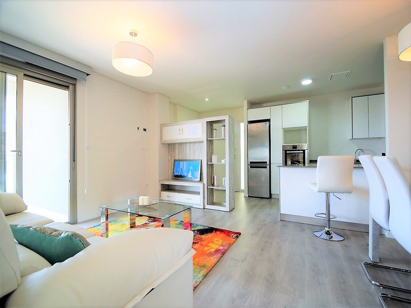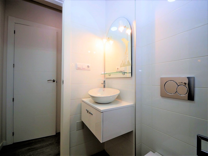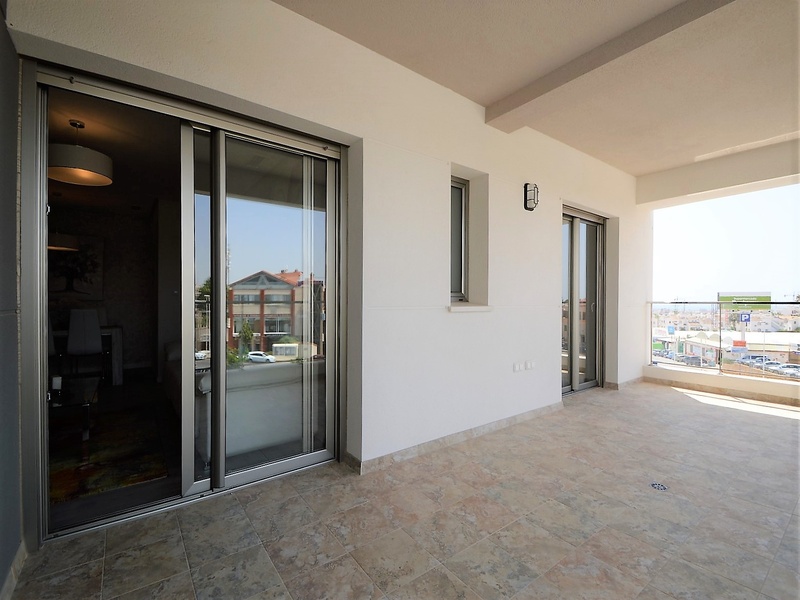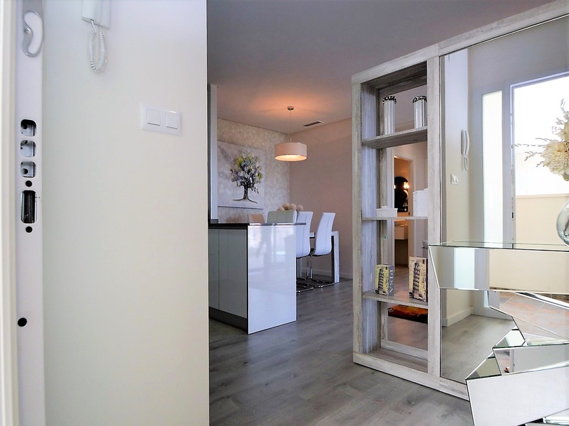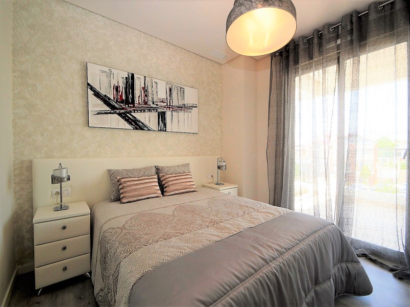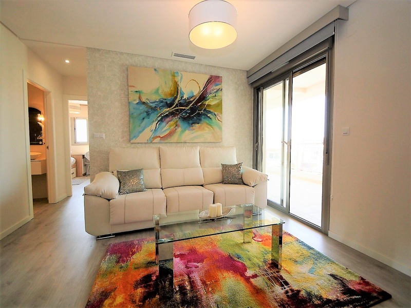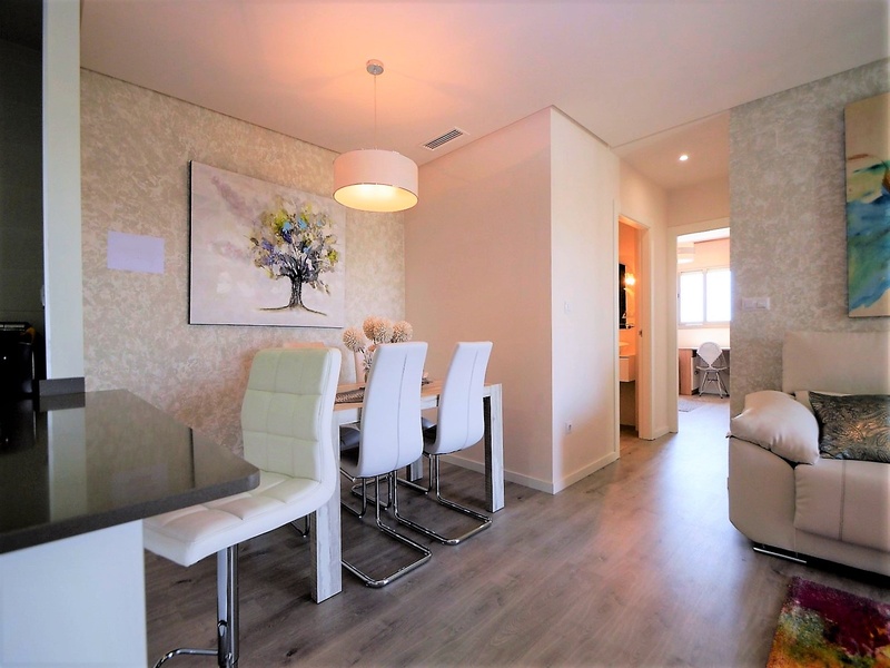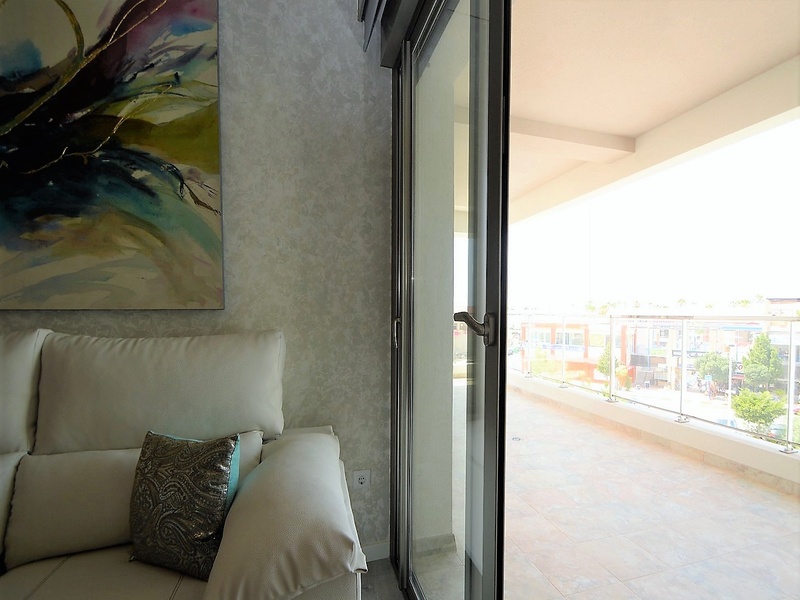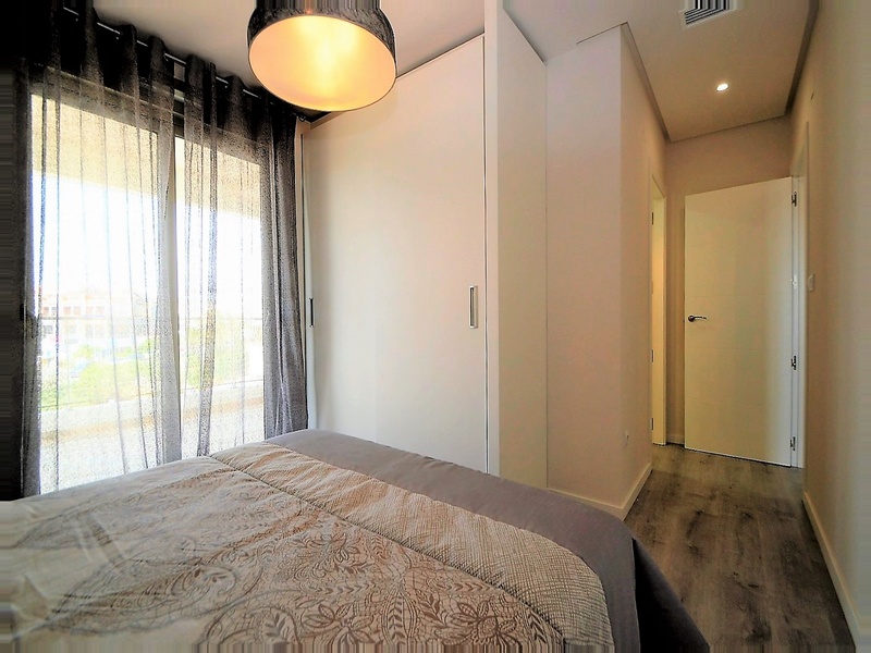 Ground floor apartment of new construction of a 5-floors building. The apartment consists of 2 bedrooms, 2 bathrooms, a living room with an american kitchen and a terrace of 47.34 square meters of a surface area. The apartments disposes of built-in wardrobes, fully furnished and equipped with white goods kitchen and bathrooms, telephone and television installations with optical fiber, heated floors in the bathrooms, heating, air conditioning and hot water with renewable energy, an armoured main entrance door, double glazing and aluminum shutters. The housing complex consists of 7 blocks and disposes of common gardens, children's playground area, swimming pools, an indoor spa, a gym and an underground parking. Is is located between La Zenia and Villa Martin. The best beaches of the area, the golf courses of Villa Martin, shopping centres, sports centres, schools, seaport, etc. are within less than 10-minutes driving distance.