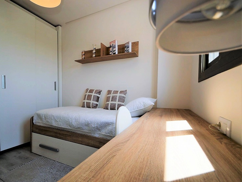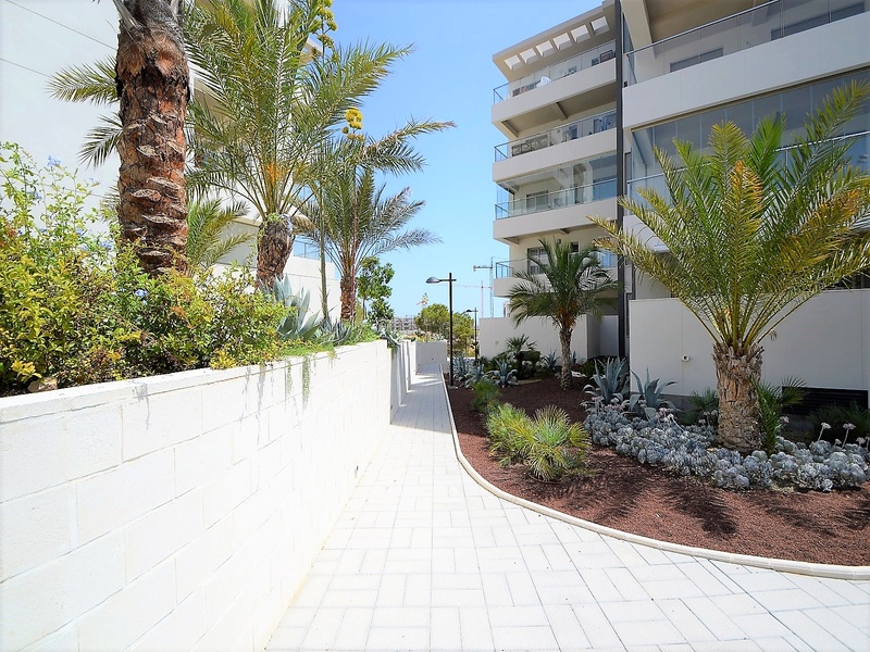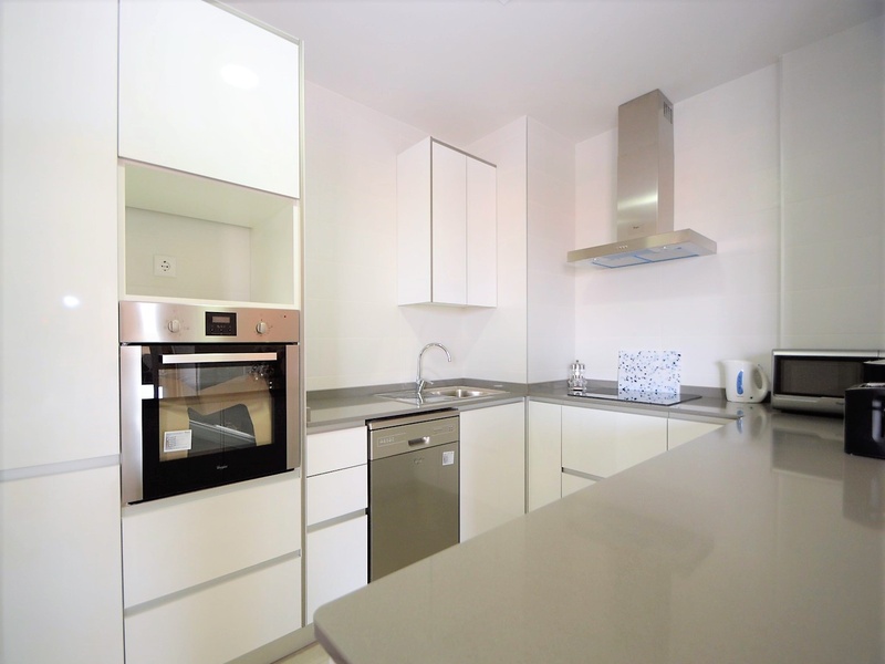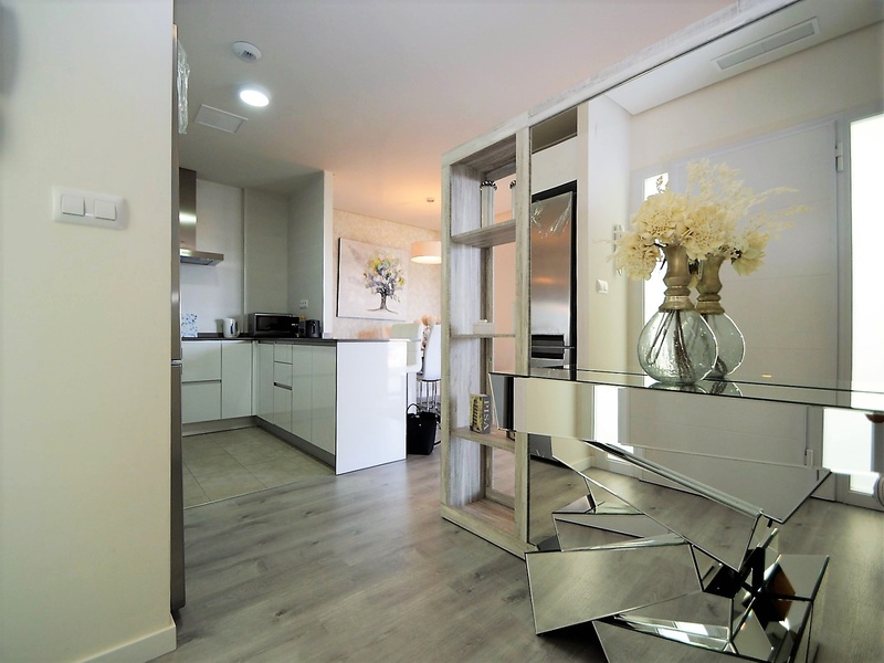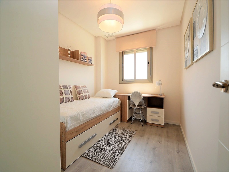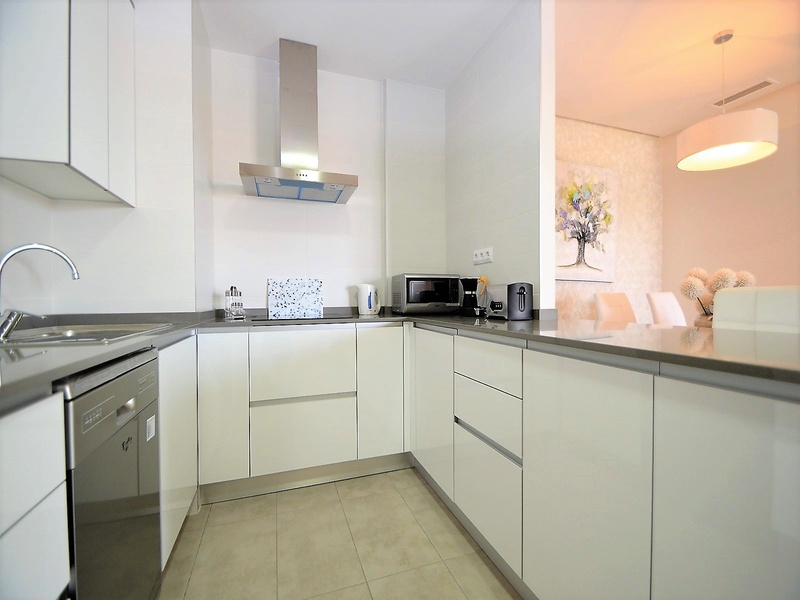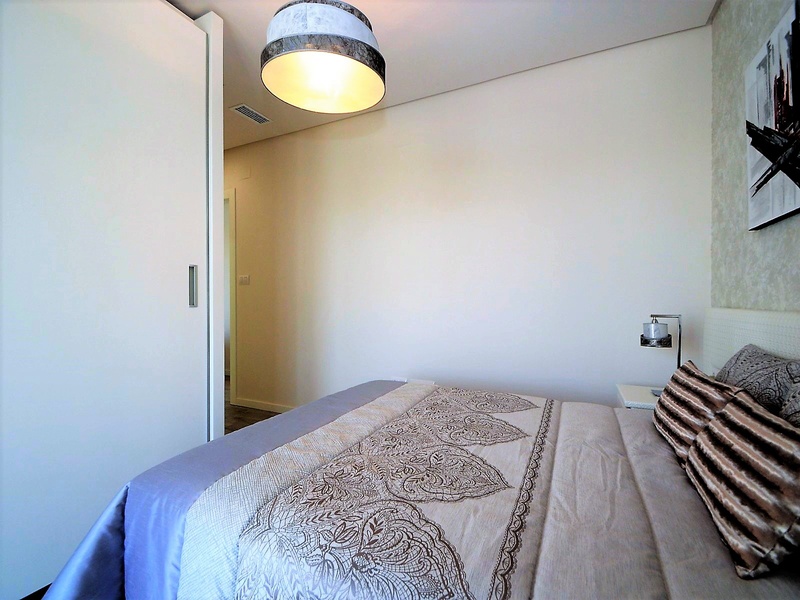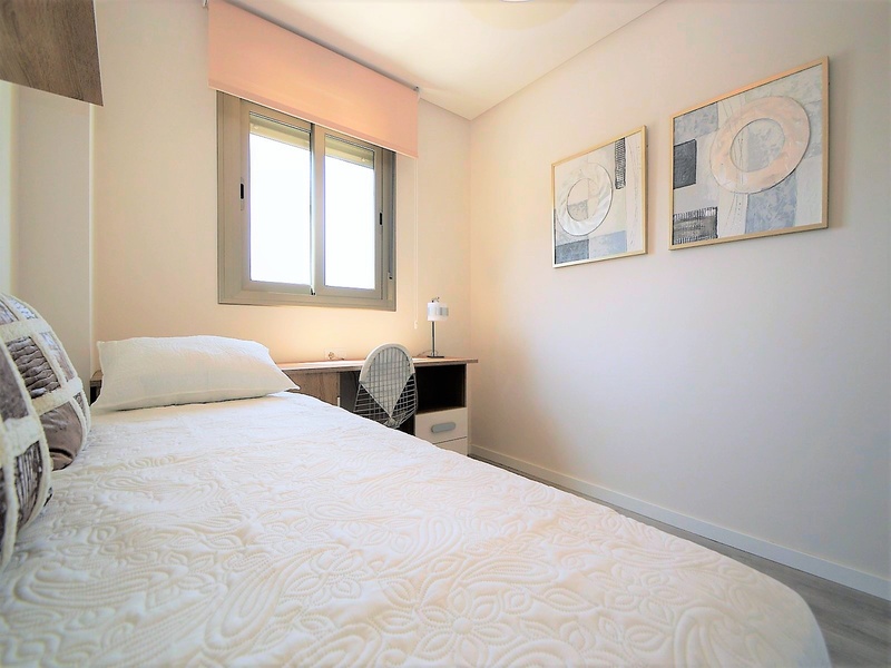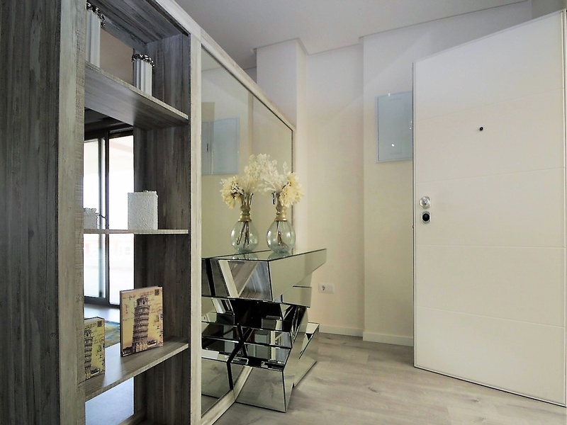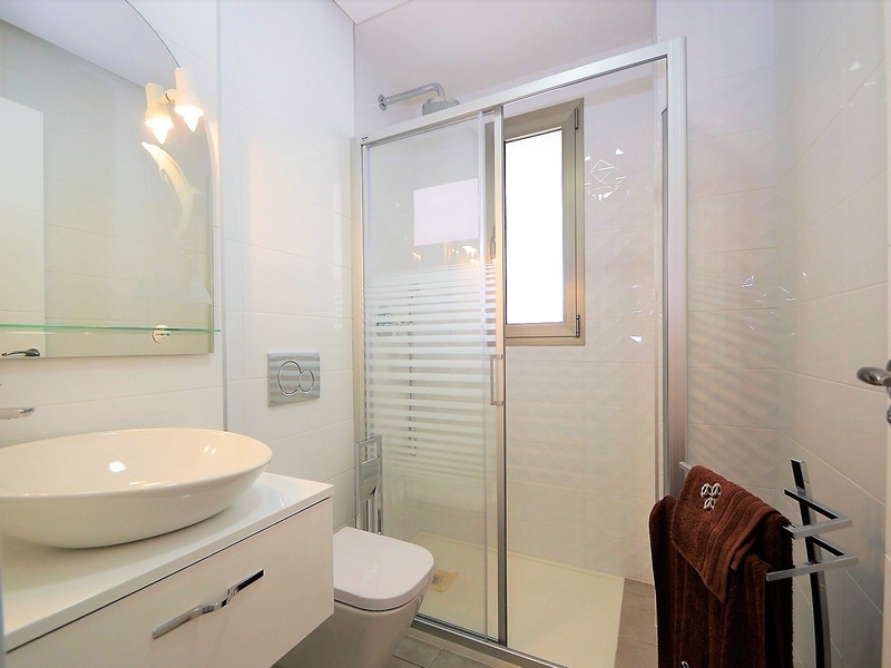 Ground floor apartment of new construction of a 5-floors building. The apartment consists of 2 bedrooms, 2 bathrooms, a living room with an american kitchen and a terrace of 47.34 square meters of a surface area. The apartments disposes of built-in wardrobes, fully furnished and equipped with white goods kitchen and bathrooms, telephone and television installations with optical fiber, heated floors in the bathrooms, heating, air conditioning and hot water with renewable energy, an armoured main entrance door, double glazing and aluminum shutters. The housing complex consists of 7 blocks and disposes of common gardens, children's playground area, swimming pools, an indoor spa, a gym and an underground parking. Is is located between La Zenia and Villa Martin. The best beaches of the area, the golf courses of Villa Martin, shopping centres, sports centres, schools, seaport, etc. are within less than 10-minutes driving distance.