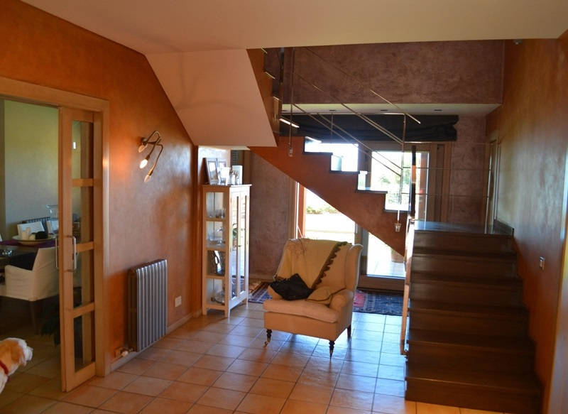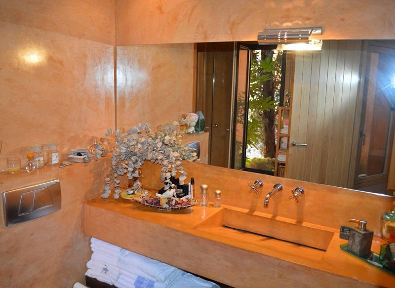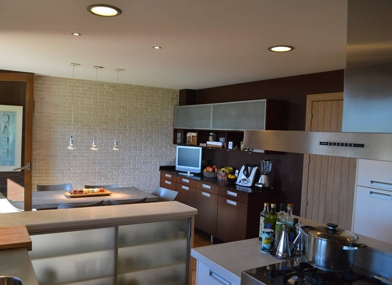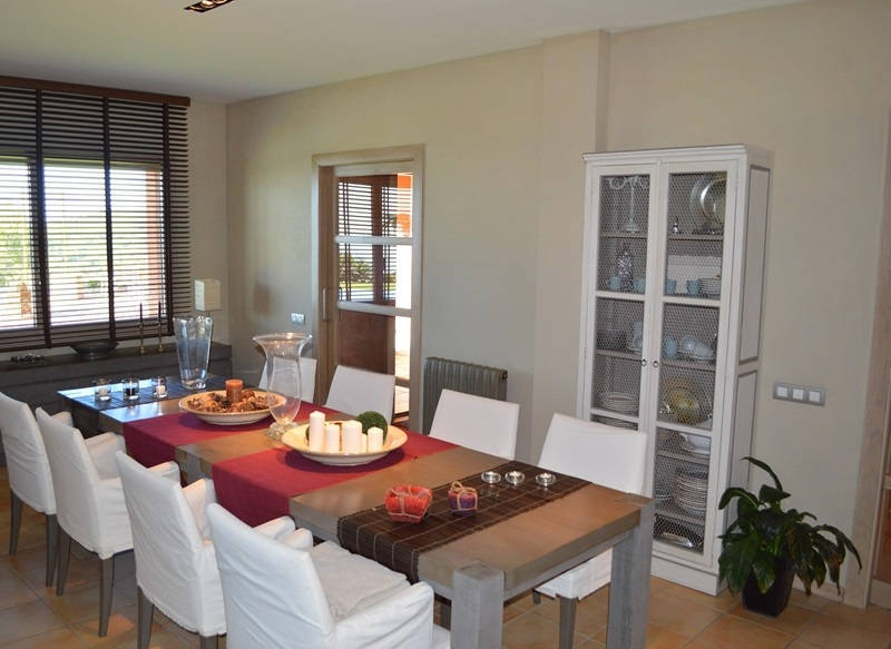 Просторная гостиная со столовой и выходом на террасу и в сад к переливному бассейну 12х4, оборудованная и полностью экипированная кухня с островом, три супружеские спальни с ванными комнатами, ещё одна спальня, ванная комната и кабинет, прачечная.