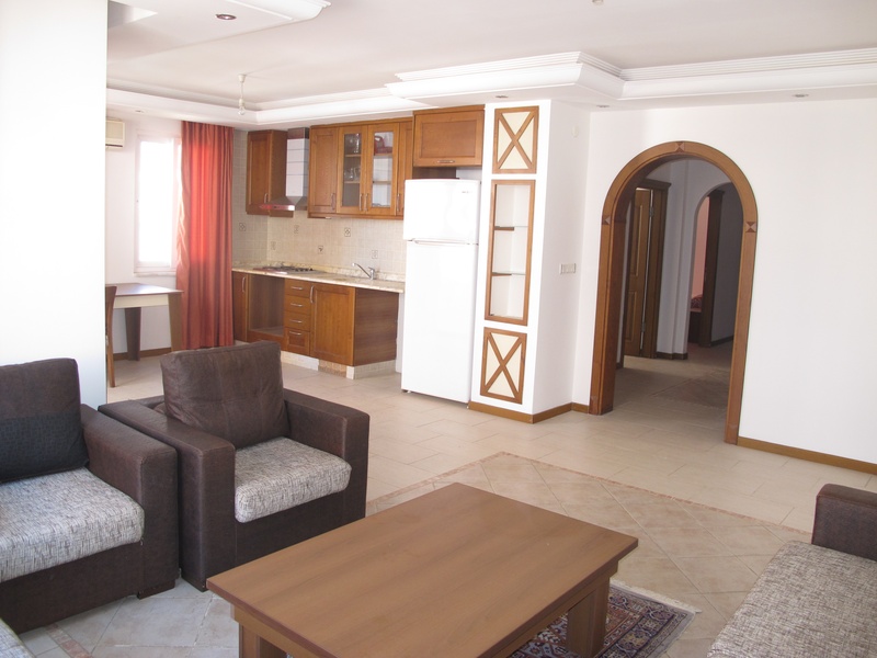 2 bedroom apartment is 115 m2 with open plan kitchen living room, 2 bathroom and 2 balconies. Apartment is fully furnished including white goods.
