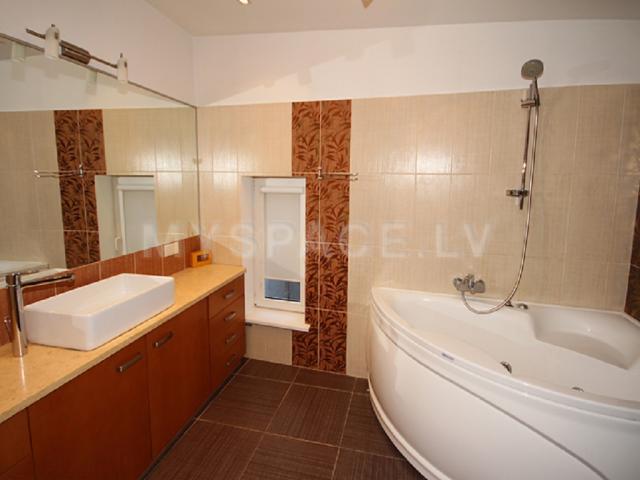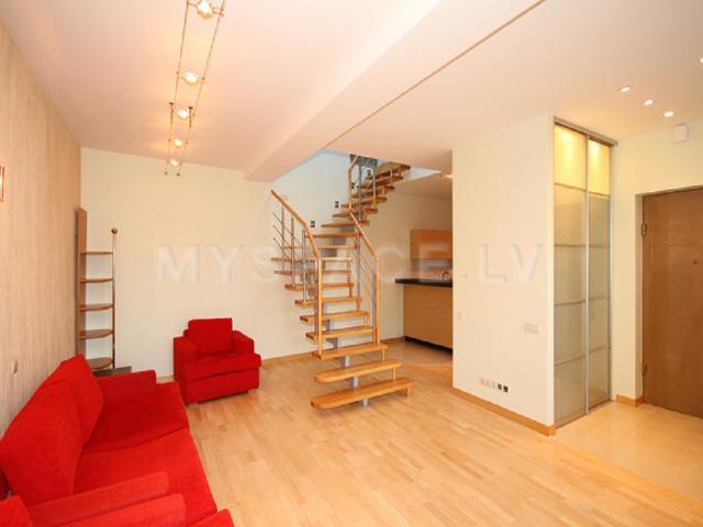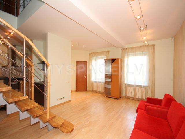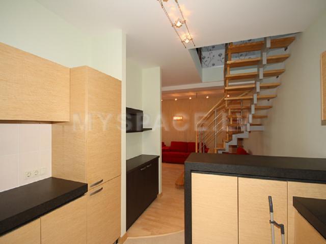 Rent a sunny, designer-mansard apartment in two levels in the center of the city. The pre-war house, the area of 96 sq.m., 5/6 floor. Fresh repair. Laminate, double glazing, new radiators. In the lower floor there is a living room with a kitchen (studio). Built-in kitchen with dishwasher, washing machine, with a spacious fridge with freezer, gas stove with oven, extractor fan. As on the floor there is a separate guest toilet. In the living room there is a sofa, an armchair and a corner shelf. On the second floor there is a bedroom with a built-in wardrobe and a double bed, a study or a children's room and a spacious bathroom with a Jacuzzi. The apartment is very quiet and is a two minute walk from the Vermanas Garden. Closed staircase, alarm, video surveillance. This is a place for parking and a good flow of public transport. When signing the contract, payment for the first month and a security deposit of one month.