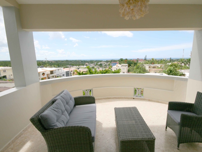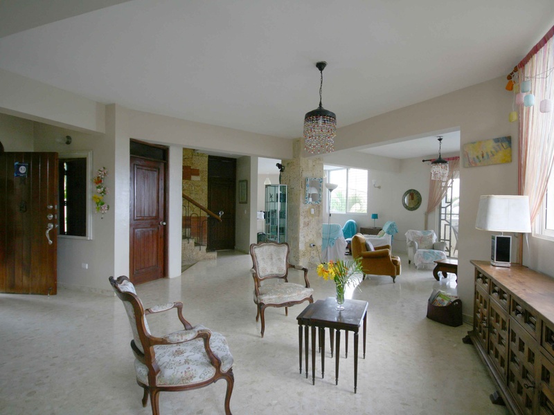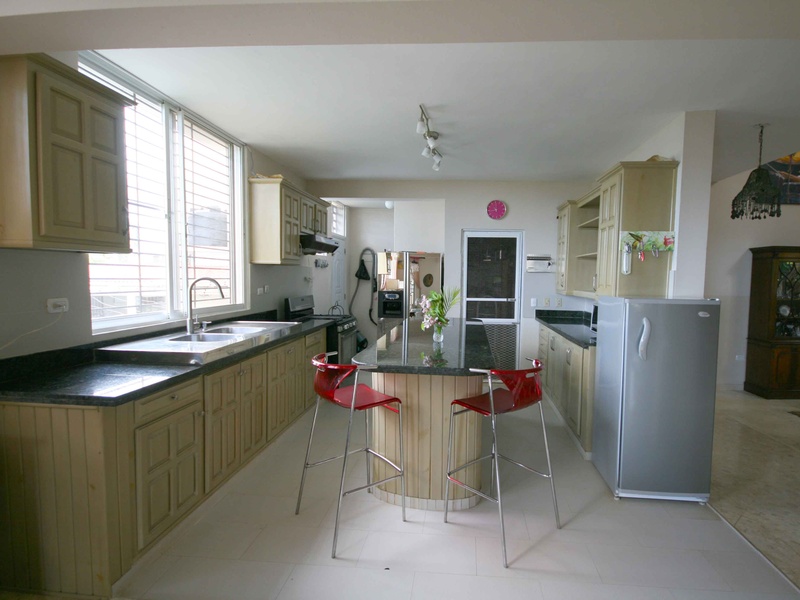 This sprawling ocean view home offers luxury, quality and modern design and is located close to the exclusive community of Casa de Campo. Watch the sunset on the Caribbean Sea from one of the two sizable covered sundecks with marble floors which overlook the pool and courtyards as well as the detached cottage. This home contains 5 bedrooms and 6 bathrooms as well as a kitchen with a large island which looks out onto the dining, living and family rooms. The main level of the home is bathed in natural light and ocean breezes. Marble floors extend throughout the main and upper levels of this luxury home and the spacious kitchen countertops are all granite. The kitchen also has stainless steel appliances and the cabinets are custom made. There is access from the kitchen out to the private back yard that contains a bird aviary, workshop, storage and gently sloping gardens of palms, flowering plants and a productive banana tree as you descend the stairs to the air conditioned cottage with private courtyard.
