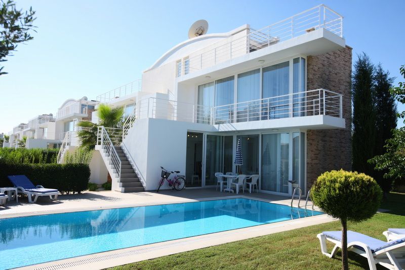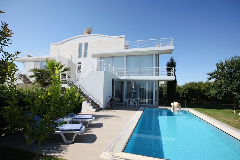 Villa with an exclusive design in Belek for sale. The villa has 3 floors with 3 bedrooms, 2 bathrooms and a guest WC. There is a private swimming pool, parking and garden. It is fully furnished. The house is located in a complex which has 24 houses and can provide a 5% rental income a year.